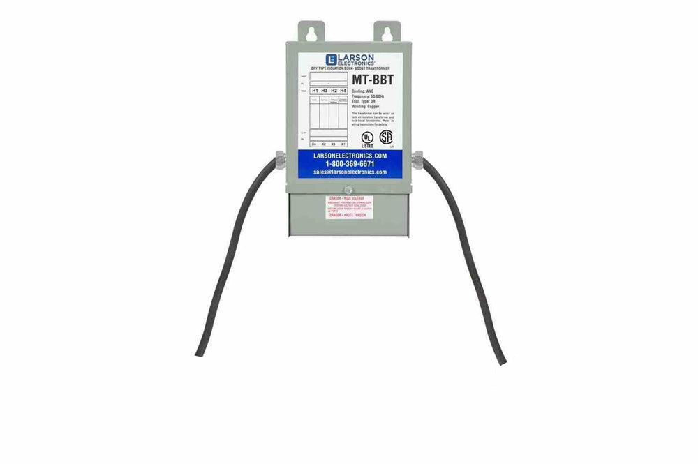 The MPD-MT-BBT-208V-240V-31.2A-10FT.2FT-BCE Single Phase Prewired Step-Up Buck and Boost Transformer from Larson Electronics is powerful, reliable, and designed with the environment in mind. Suitable for both indoor and outdoor applications, the MPD-MT-BBT-208V-240V-31.2A-10FT.2FT-BCE provides increased reliability, higher efficiency, protection against critical equipment failures, and an extra level of protection by isolating the power source from the connected device. The lower operating costs, lower heat emissions, and lower cost of ownership make this transformer ideal for a wide range of applications and businesses. The MPD-MT-BBT-208V-240V-31.2A-10FT.2FT-BCE is a prewired transformer for customer installation and is equipped with 10' of 8/3 SOOW cable terminated in a blunt cut end on the primary side and 2' of 8/3 SOOW cable terminated in a blunt cut end on the secondary side.