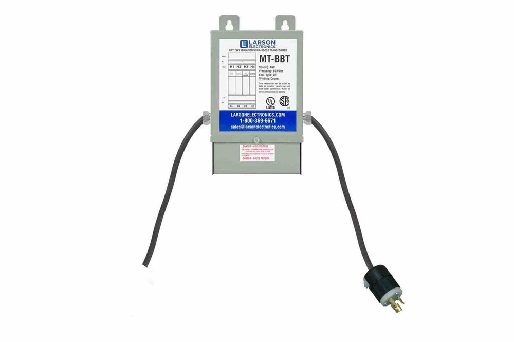 The MT-BBT-208V-240V-46.88A-2X5FT-SS2.50 Single Phase Step-Up Prewired Buck and Boost Transformer from Larson Electronics is powerful, reliable,and designed with the environment in mind. Suitable for both indoor and outdoor applications, the MT-BBT-208V-240V-46.88A-2X5FT-SS2.50 provides increased reliability, higher efficiency, protection against critical equipment failures and an extra level of protection by isolating the power source from the connected device. The lower operating costs, lower heat emissions and lower cost of ownership make this transformer ideal for a wide range of applications and businesses. The MT-BBT-208V-240V-46.88A-2X5FT-SS2.50 is a prewired transformer for customer installation and is equipped with 5` of 6/4 SOOW cable on each side connected to the transformer with a NEMA SS2 Marine connector on the primary side and a blunt cut end on the secondary side.