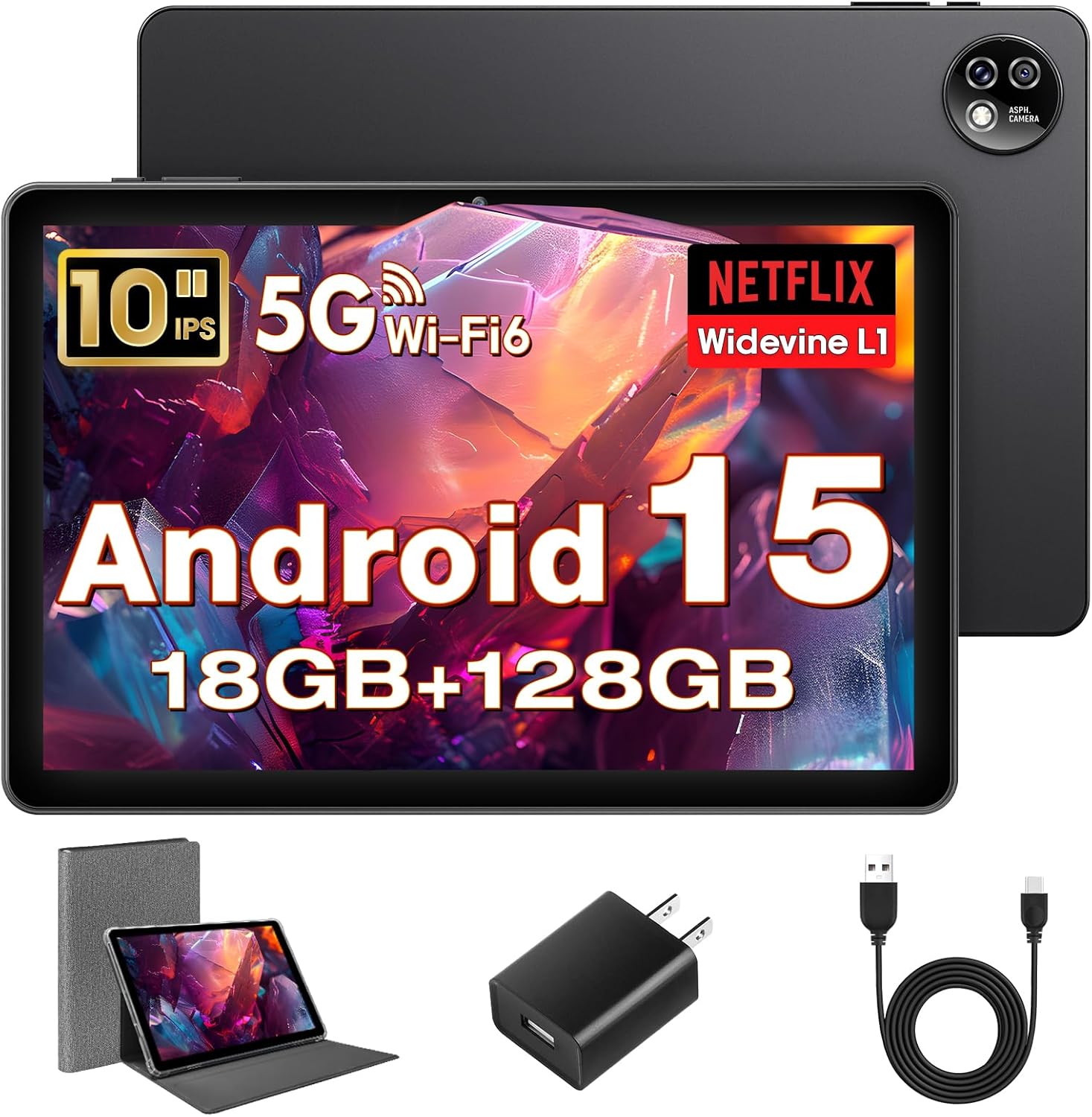 10 Inch Tablet Android 15 Tablets, Octa-Core Tablette Android, 18GB+128GB, 1TB Expand, 1280x800 IPS HD Display, GPS, Widevine L1, 5G+2.4G WiFi, 5MP+8MP Dual Camera, Bluetooth5.4, 6000mAh, BlackPL17-B0F5389J9J