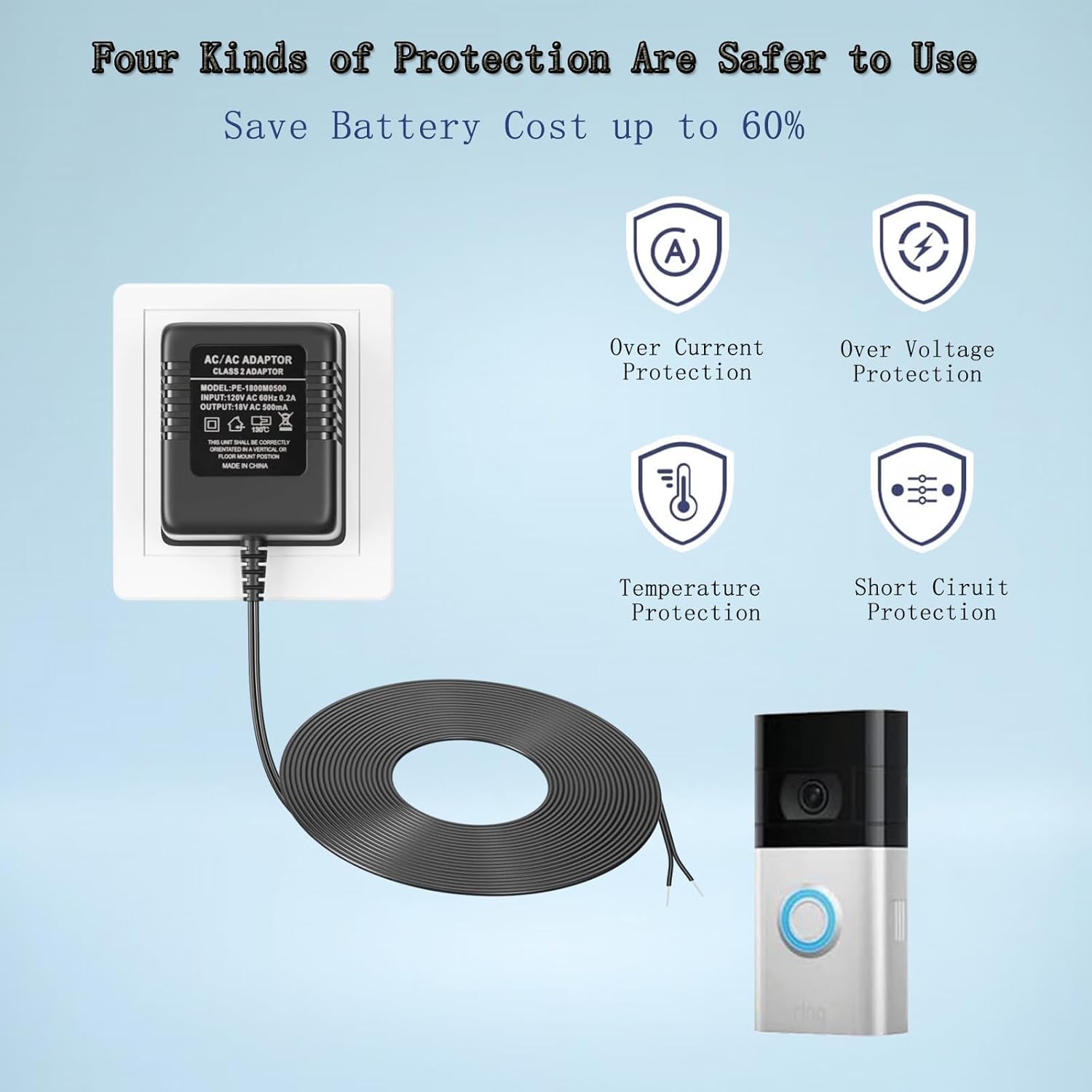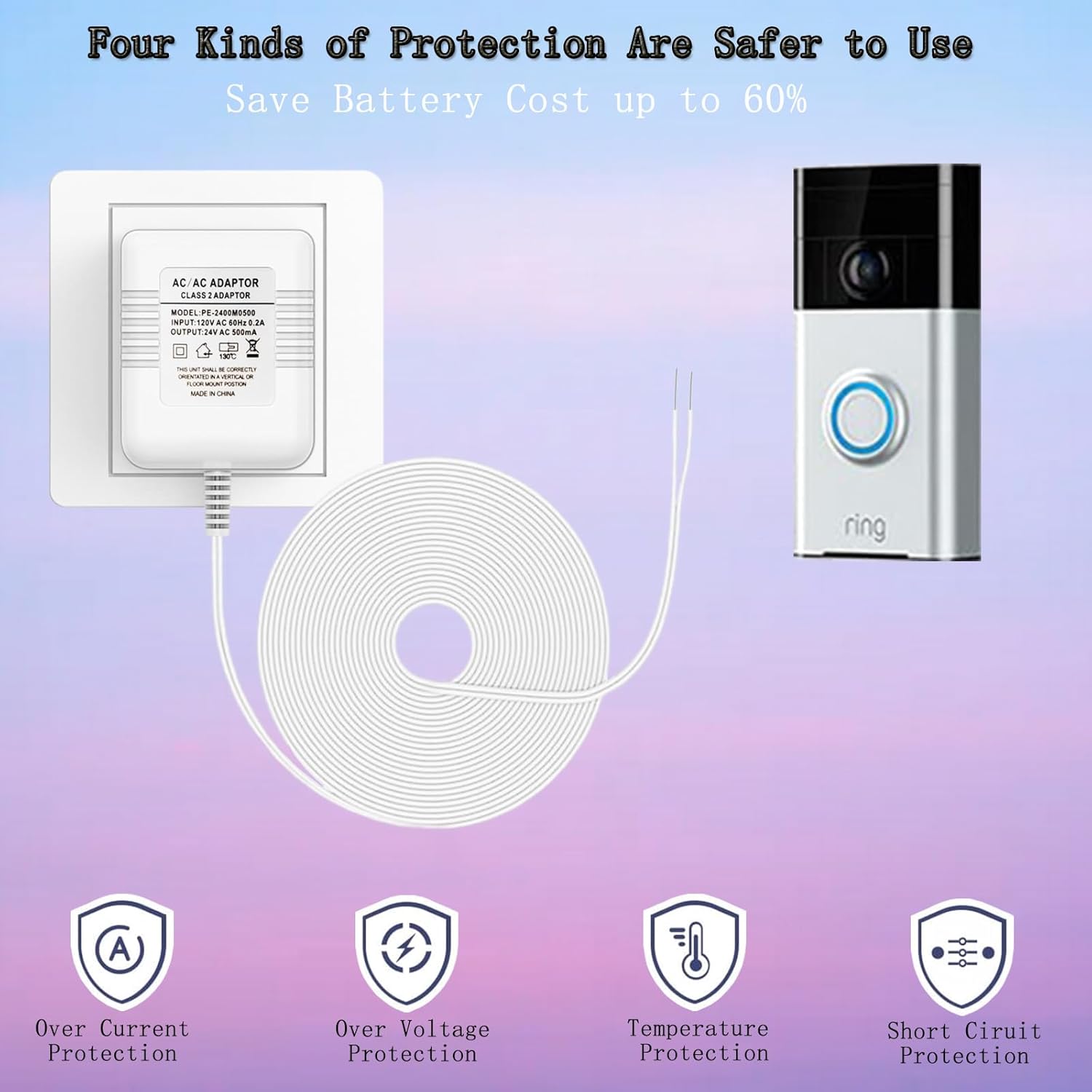 24V 500mA Power Adapter,Extra Long 26ft Extension Cabel Doorbell Transformer for Nest Ecobee Sensi,Honeywell,Ring Video Doorbell,Wyze Doorbell,Eufy Pro Cam,Power Supply