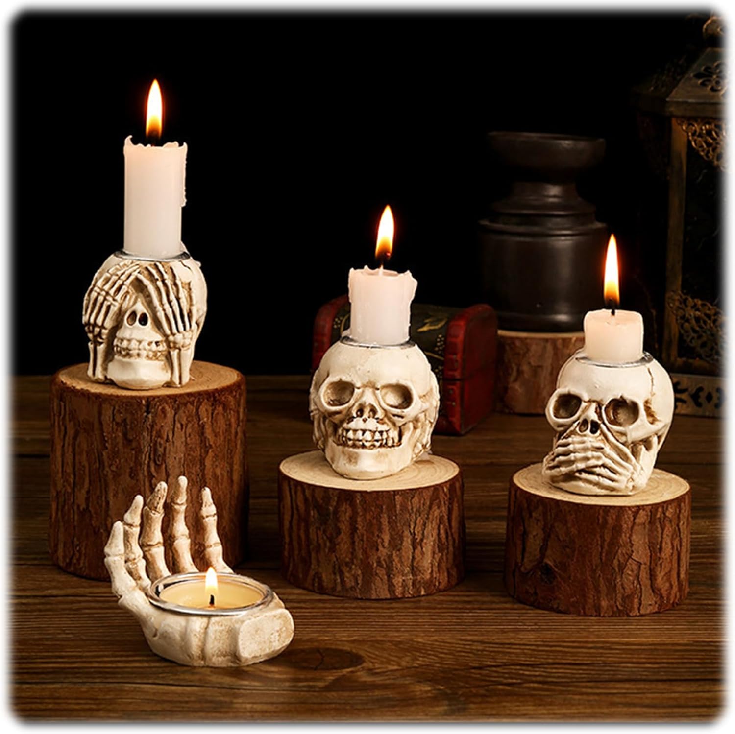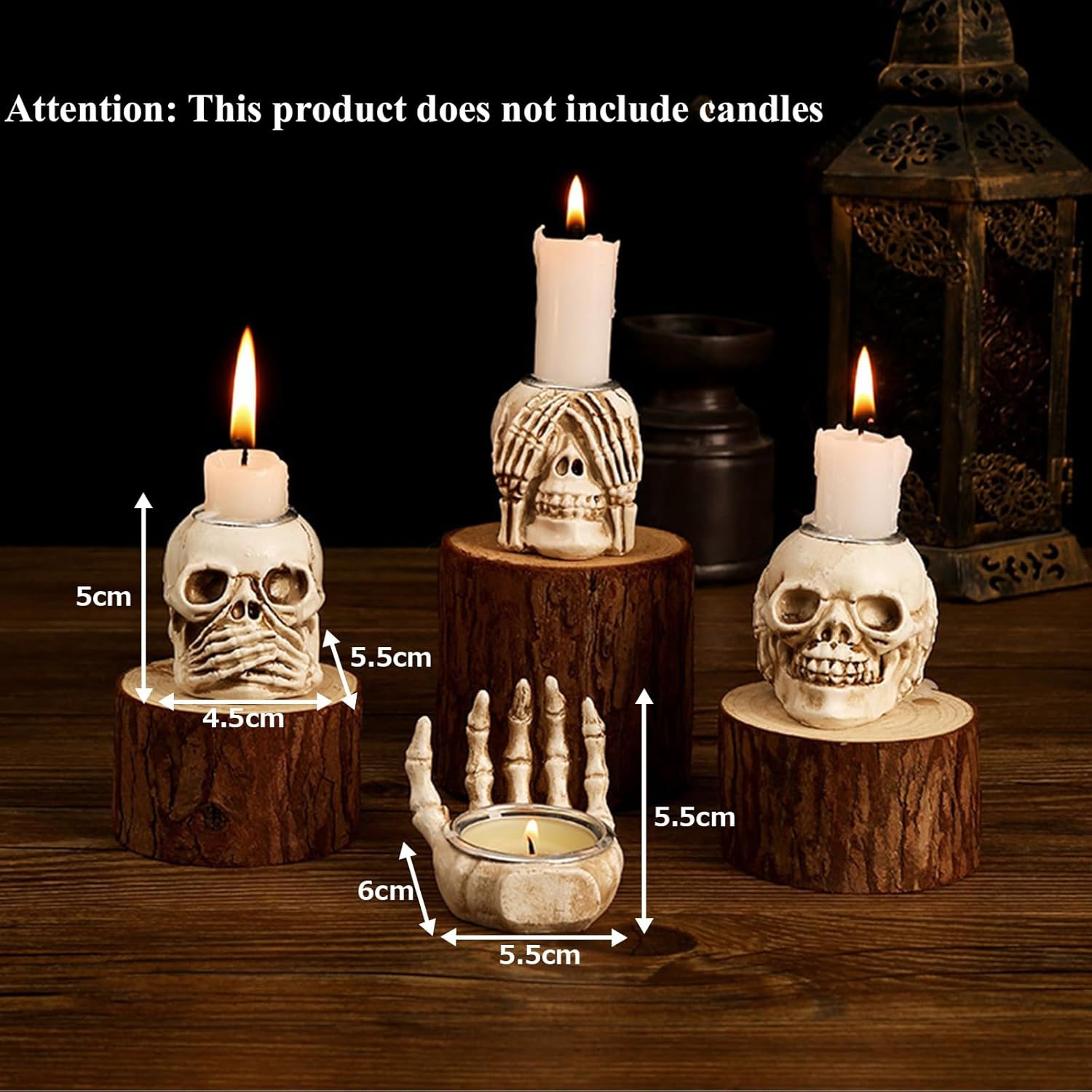 【What You Will Get】: 4pcs of skeleton theme candle holders for you,includes 1pcs skeleton palm and 3pcs of skull shape,making a touch of Gothic atmosphere to your home or party.(Candle is NOT INCLUDED)