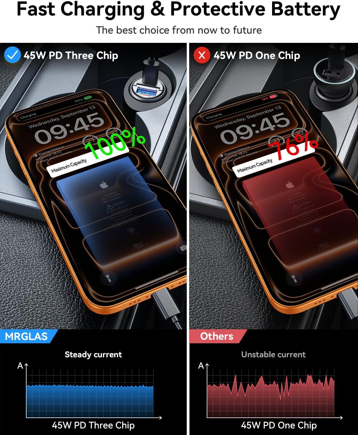 • PD45W+QC45W SUPER FAST CHARGING: MRGLAS 90W car charger adapter fast charging supporting PD 45W(usb-c port) and QC 45W(usb-a port) high output, Can fast charge all prevailing phones/iPad/tablet at the same time. Makes the IPhone 17 Pro Max and Samsung Galaxy S25 charging time from 0% to 89% in 30 minutes