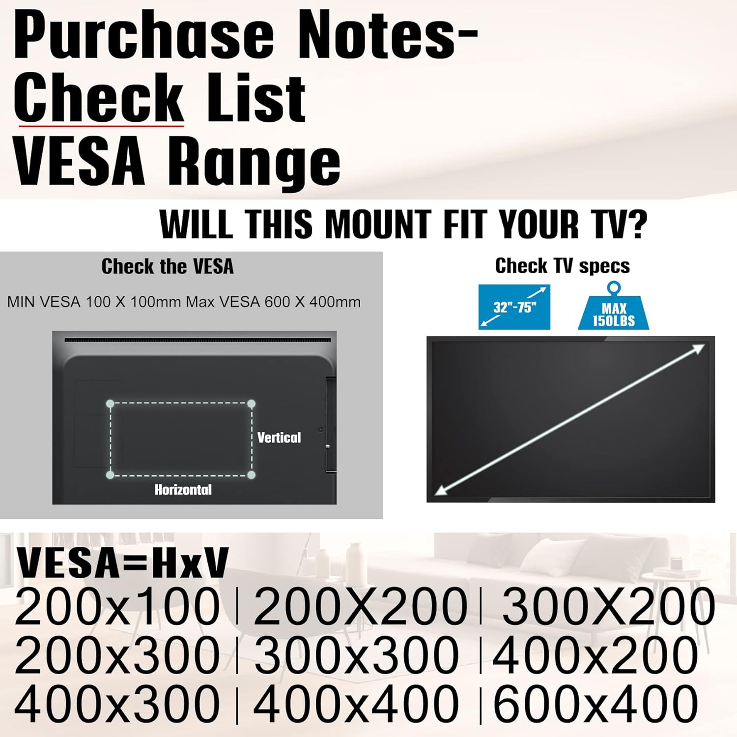 - Compatibility: This wall TV bracket mount fits 32" to 75" screens with VESA 100x100 mm to 600x400mm mounting holes (The VESA mounting patterns are the distances between the four screw holes on the back of the TV); Compatible with a wide range of TV brands