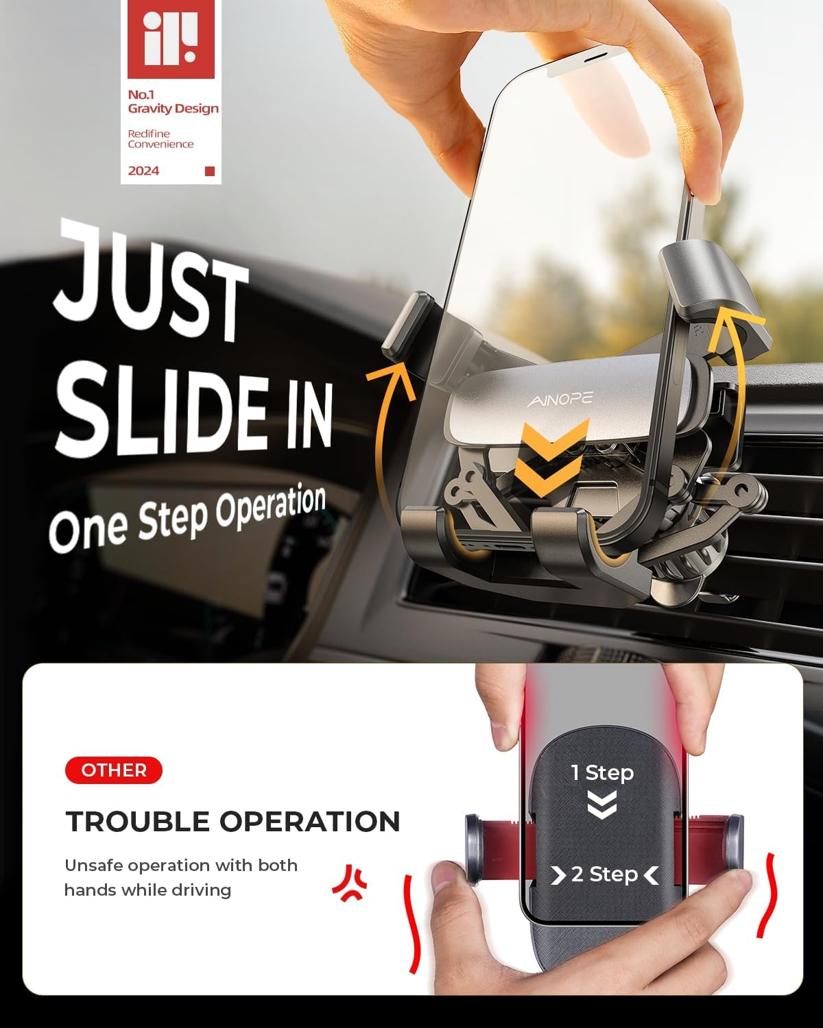 - THE EASIEST OPERATION & JUST SLIDE IN AND GO: Just slide in your phone, car phone holder mount clamps the phone automatically by gravity and provide the easiest operation and a strong stable hold without button to press. Easy to drop phone in and pick phone up with two fingers.