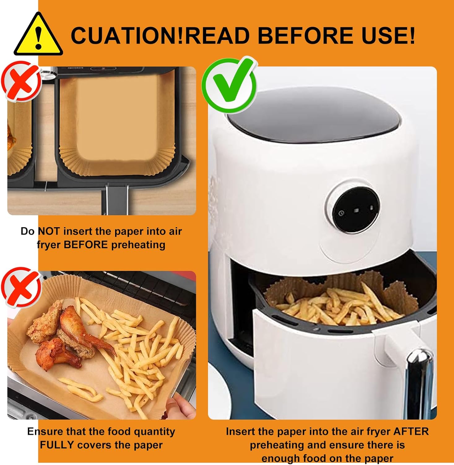 💞PRO TIP:1.Measure your air fryer basket before you buy to get the right size air fryer liner! 2.Never preheat empty parchment paper for air fryer, and avoid using it with very small quantities of food. The air fryer paper, being lightweight, can lift up due to the air flow and get blown into the heating element, causing it to scorch or burn.