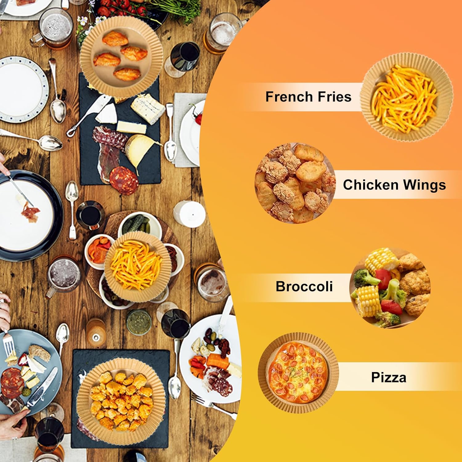 🍀 HEALTHY MATERALS:Our air fryer liners are crafted from unbleached, natural brown parchment paper and treated with vegetable oil, making them 100% healthy and eco-friendly. The food-safe fryer paper offers excellent heat resistance, withstanding temperatures up to 420°F (approximately 200°C), while preserving the natural flavors of your food.