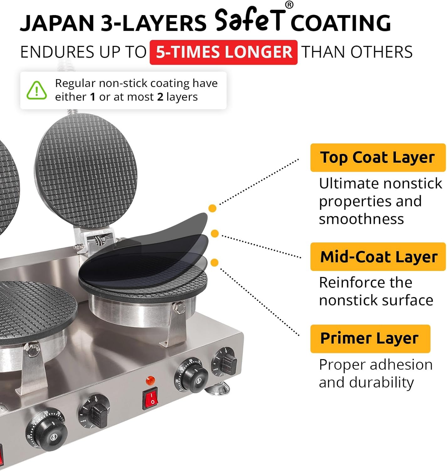 ✪ NONSTICK COATING: The baking plates are made of cast aluminum with a nonstick top. The nonstick coating prevents the dough from sticking and burning. The plates are highly conductive and get warm fast and evenly, providing uniform heating. As a result, cone waffles obtain a beautiful golden-brown color that makes them look so appetizing! To keep the plate clean, just wipe it wit