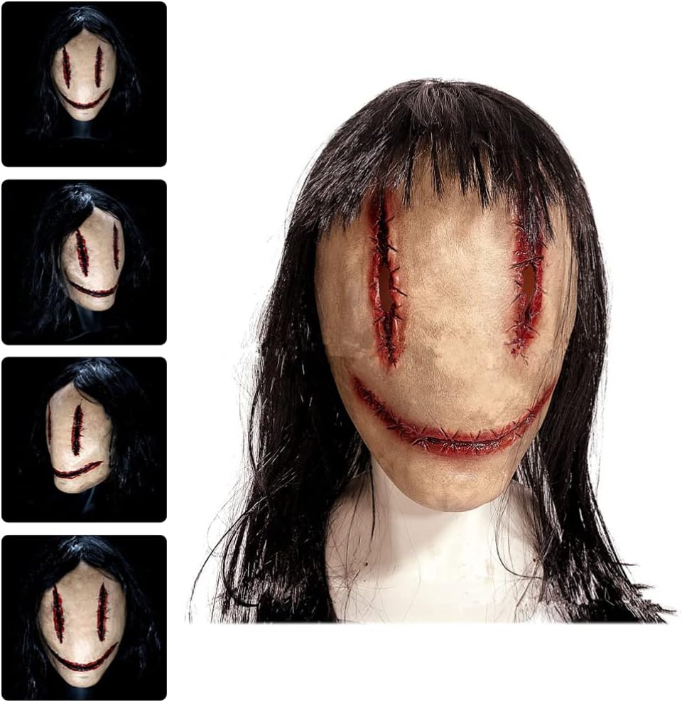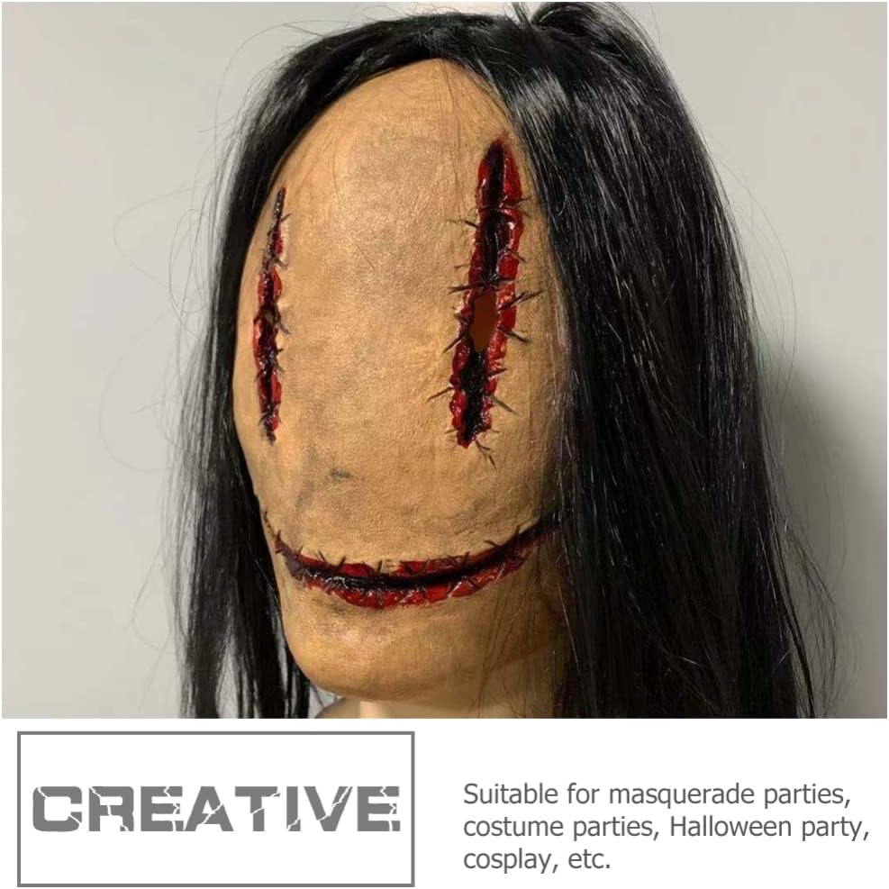 • HORROR MASK: This mask is designed with a female ghost appearance, the skin and hair are made realistic and scary, a great mask choice for Halloween or cosplay parties, creating an horror atmosphere.