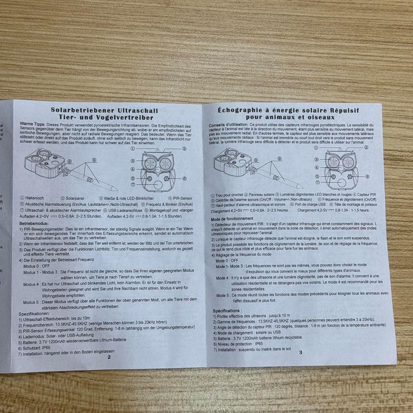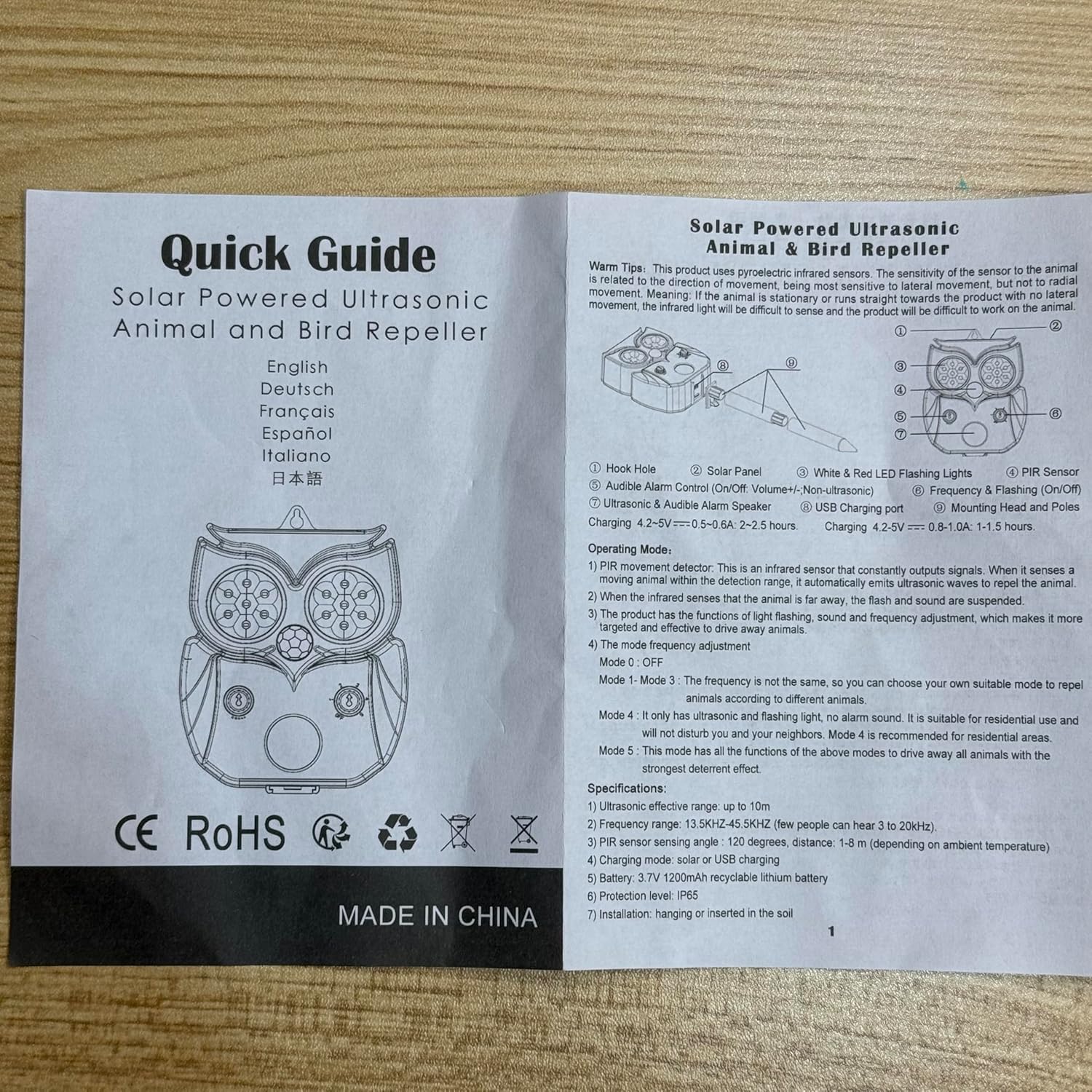 Easy To Use:Squirrel repellent is portable and compact. Simply insert the solar repeller into the soil where it can receive sunlight and turn it on to start functioning. Cat repellent can also be mounted vertically on a wall or nailed to other surfaces. Raccoon repellent device is maintenance-free and portable, making it perfect for taking on camping trips to keep wild animals away.
