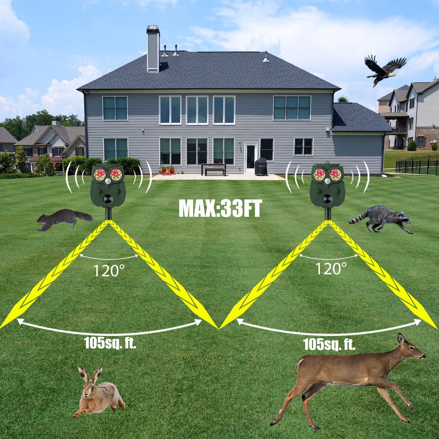 Powerful Animal Repeller Deterrent:Keep pests away with high-frequency sound waves, alarm tones, and flashing LED lights! This solar-powered animal repeller covers a 120° angle and reaches up to 30 feet, creating a safe, pest-free zone for your yard, garden, or patio.