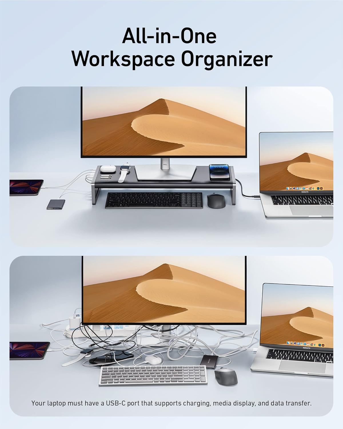 - All-in-One Workspace Organizer: Stand your monitor on top of the docking station, and use the space underneath to store your keyboard, mouse, and other peripherals when you're not using them.