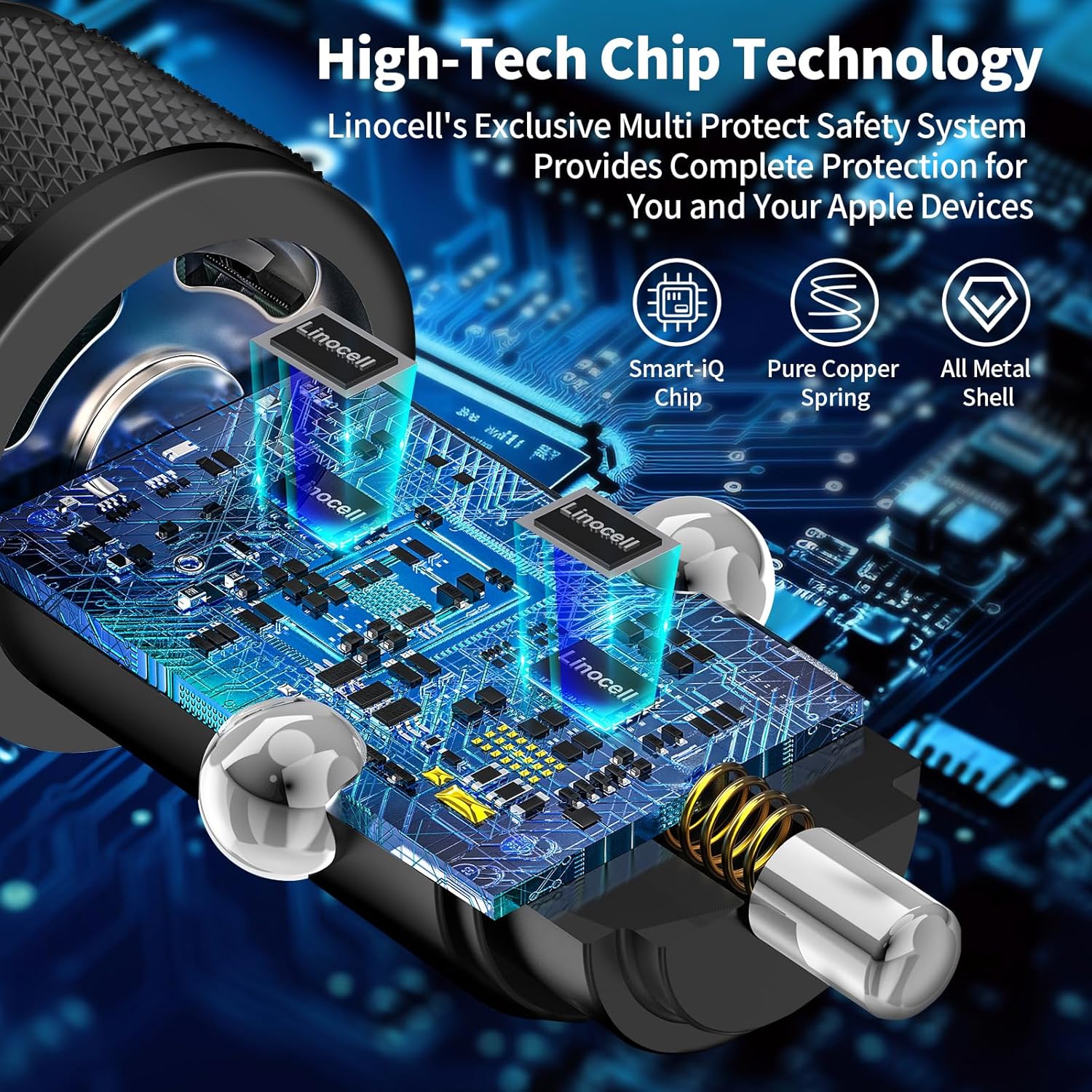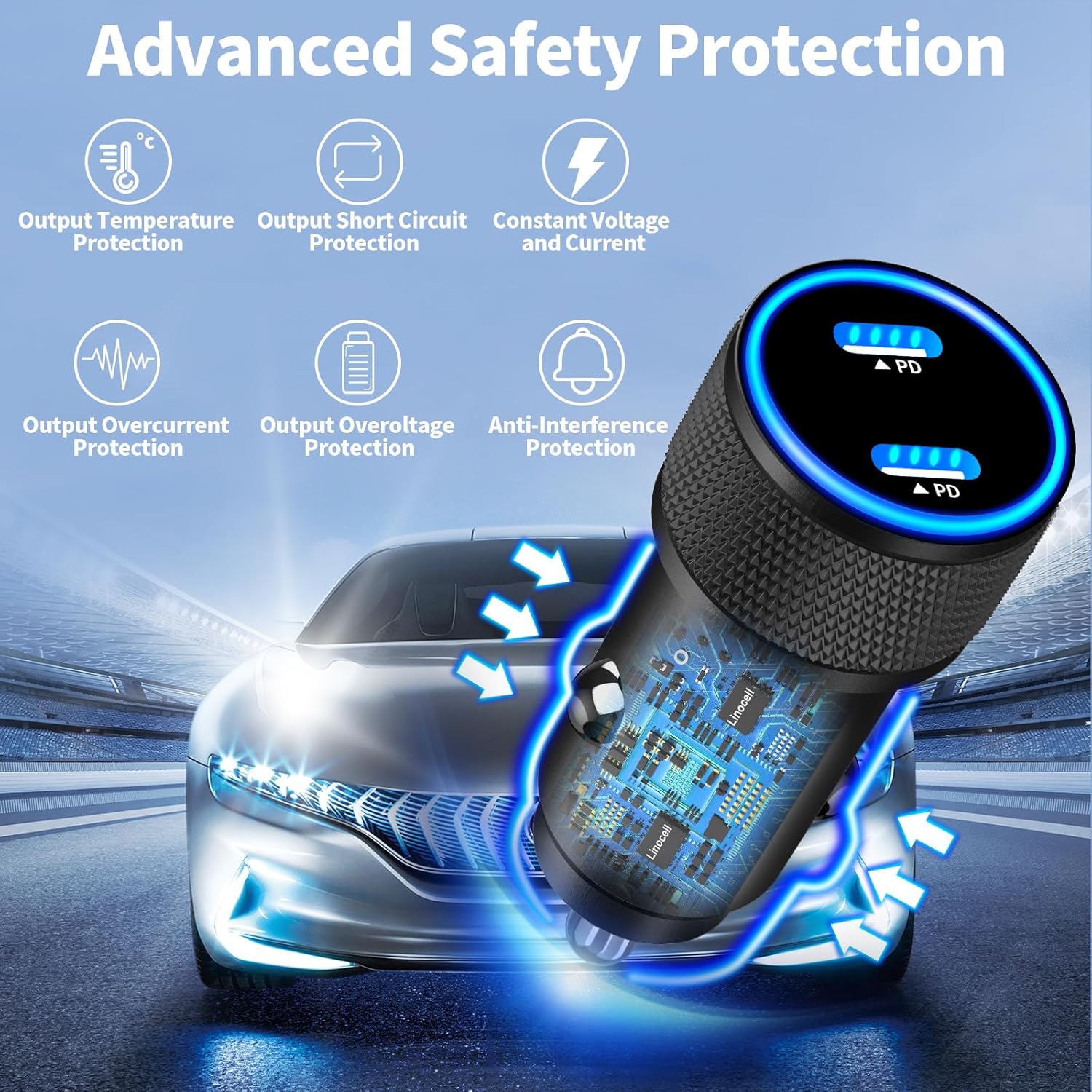 - 【Configuring Dynamic Temperature Sensors】: The Built-in Dynamic Power Chipset in Linocell's 90W Dual PD USB-C Car Charger Fast Charging ensures the frequency is minimal that no more worrying about the interference of your radio or GPS. Safe car charger equipped with over-voltage, over-heating, over-current modules, Features a Dynamic Temperature Sensor which actively monitors temperature, and a Power Tuner Chip which adjusts power output to safeguard your connected iPhone 17 series device.