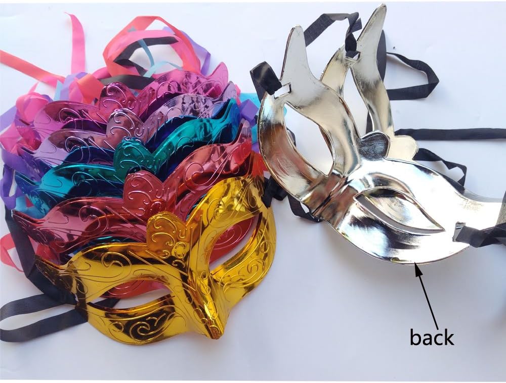 2. Package includes: 12 pcs party mask, gold, silver, red, blue, rose red, purple, each color 2 pieces One size fit all.