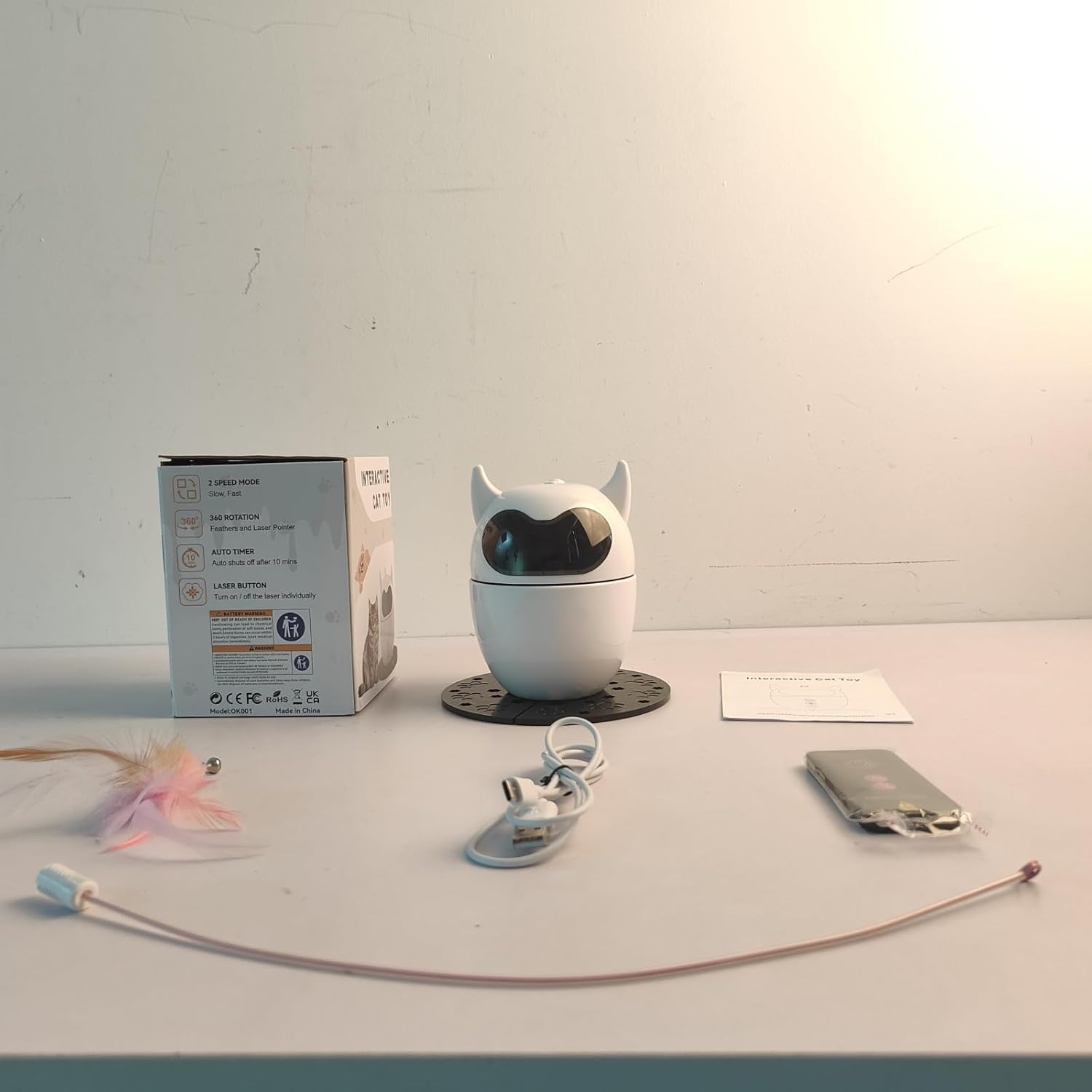 2-In-1 Automatic Cat Toy: Double red light patterns, dot and butterfly, combined with automatic 360° rotating trajectory, quickly movement stimulates cats to chase and play. Feather Wand with bell is rotated with pet toy head, attract with your cat kitten