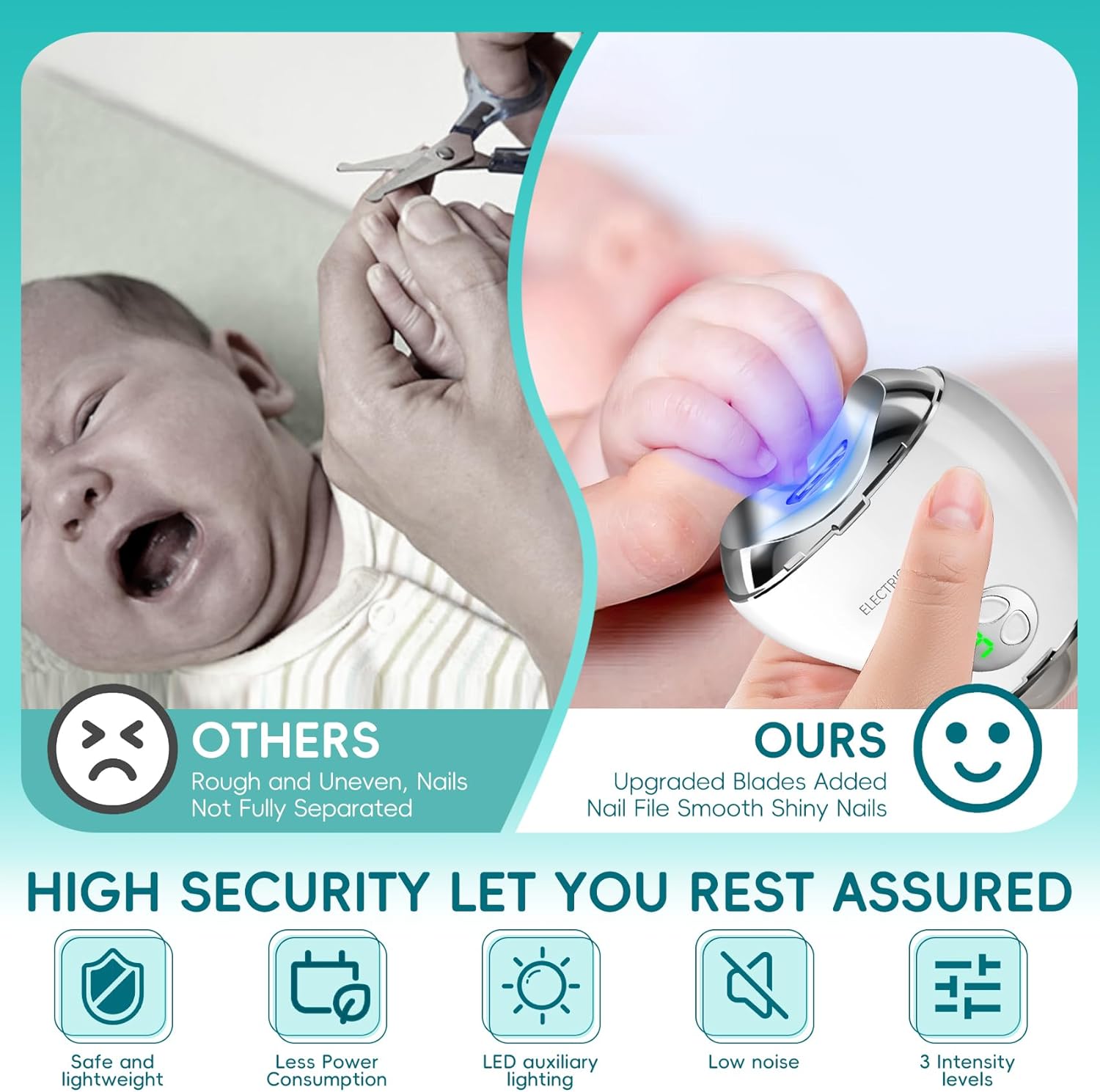 - 【Front Auxiliary Light and display】Automatic nail file LED auxiliary light allows you to trim your nails safely even in dark environments, then press the up button alone to turn on the baby nail trimmer, press the down button alone to turn on the nail polisher, fingernail clipper is equipped with LED display, you can know the gear and power level.