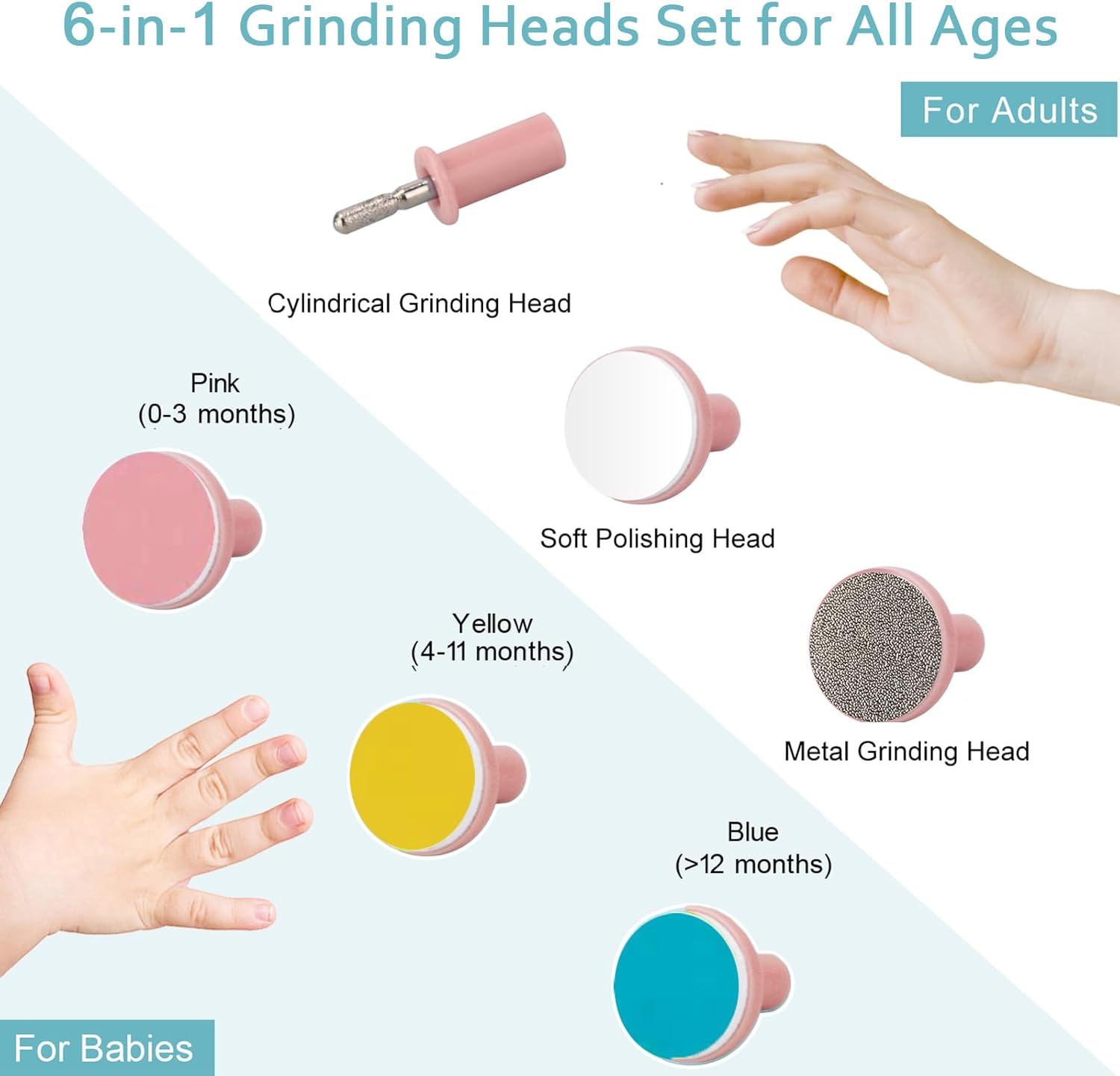 • [6-in-1 Manicure Set]: This baby nail clippers come with 6 different granding heads, 3 for baby and 3 for adults. You can choose the cuitable grooming heads for variable ages,available for newborn, baby and adults