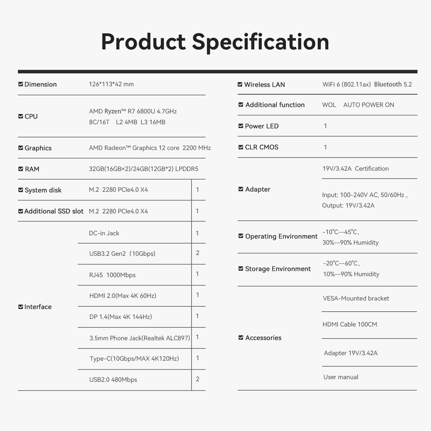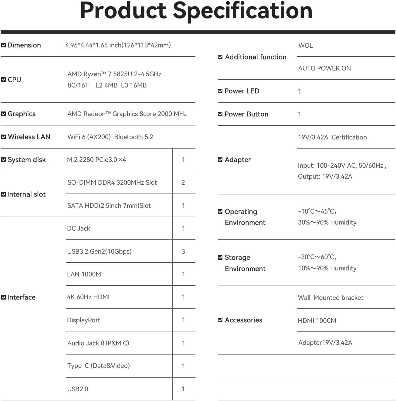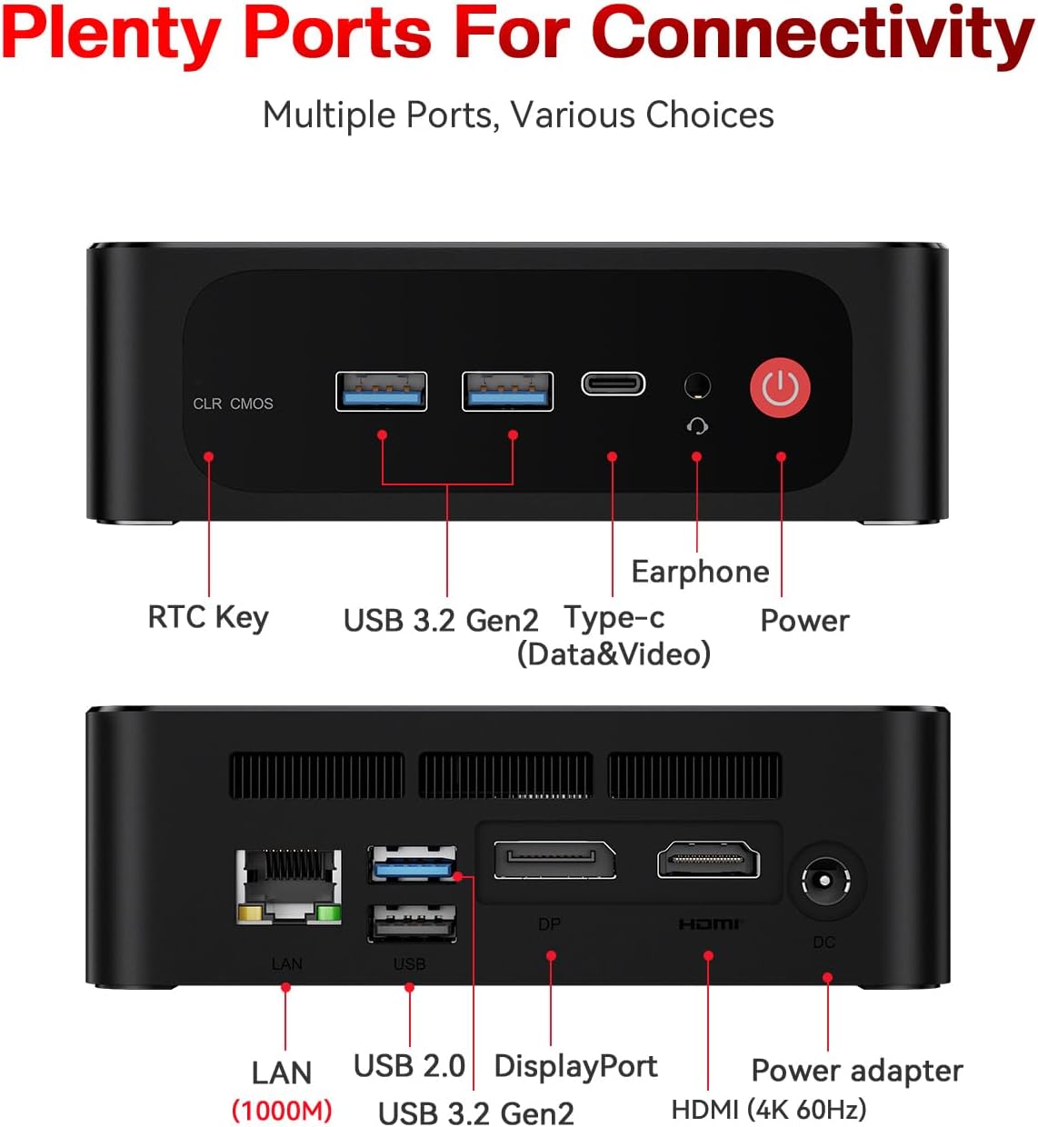 - 🔥【Multiple Interfaces & Wireless】Mini Desktop PC equipped with a Gigabit Ethernet LAN (RJ-45, supporting Gigabit file transfer speeds), Dual-band 2.4G 5G WiFi (802.11ac, stronger capacity of resisting disturbance), and built-in Bluetooth, high-speed wireless connection makes you step ahead. And 3*USB3.2 ports, 1*USB2.0 ports, 1*HDMI ports, 1*Type-C port(Data&Video) and 1*Audio Jack (HP&MIC), 1*DC Jack, thus offering the user even greater versatility in use.