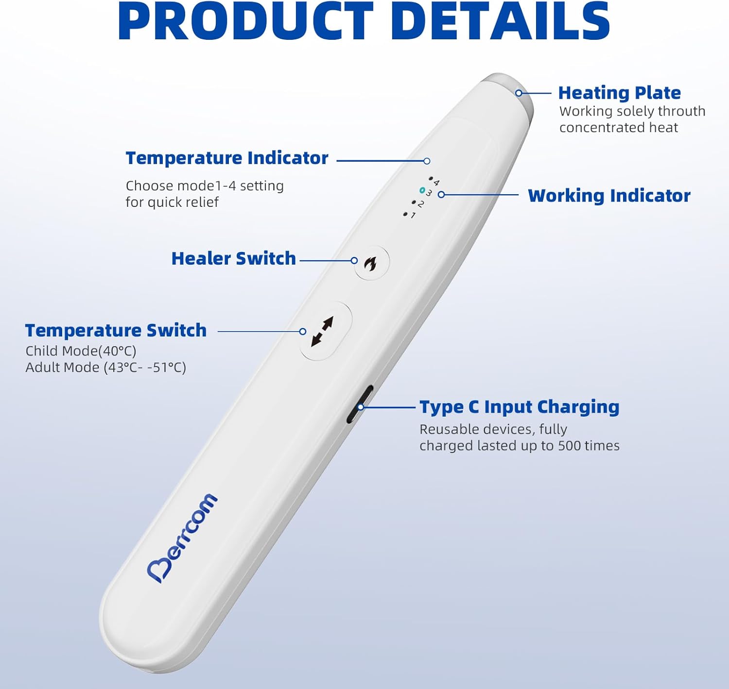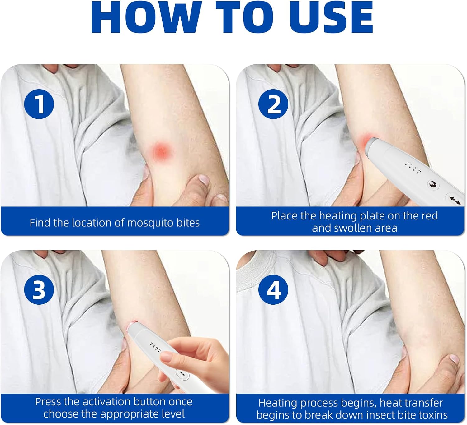 - 4 Modes Available to Choose: The insect bite relief pen features four temperature modes ranging from forty to fifty-one degrees Celsius; a smart chip allows precise control of heat; the MCH ceramic heating plate ensures a stable treatment temperature for safer use