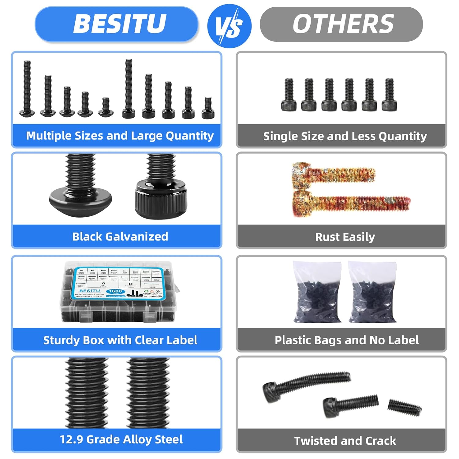 Besitu 1600Pcs M3 Screw Kit, 12.9 Grade Alloy Steel Hex Socket Button & Cap Head Metric Screw Assortment M3 Bolts and Nuts Washers Kit Black Small Machine Screw Set for 3D PrintingPL17-B0D1KQCBMT