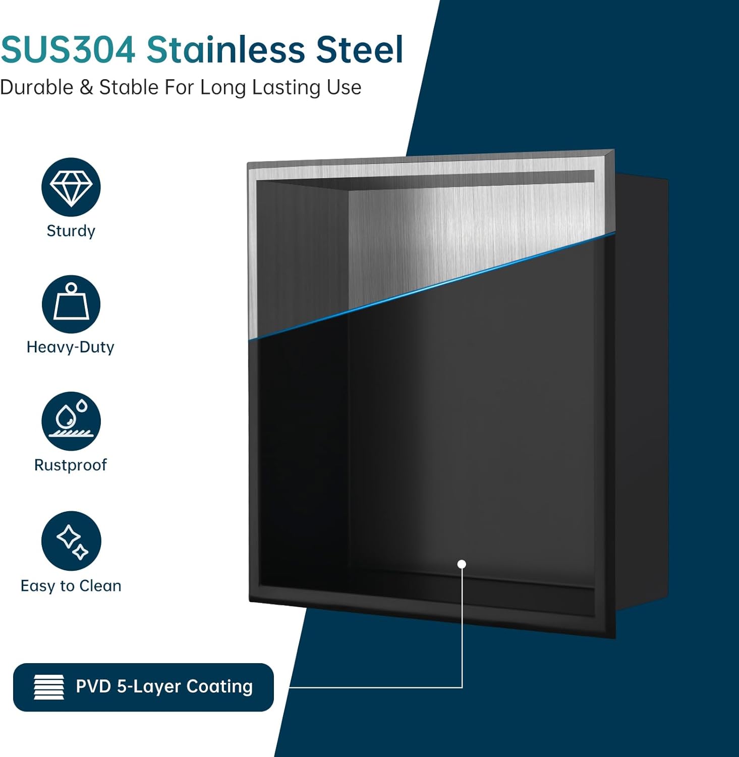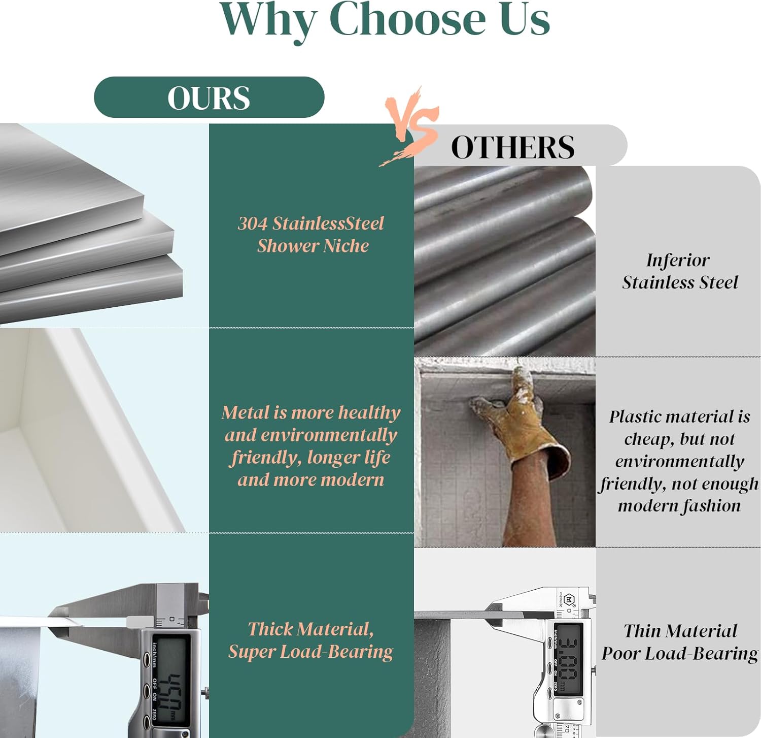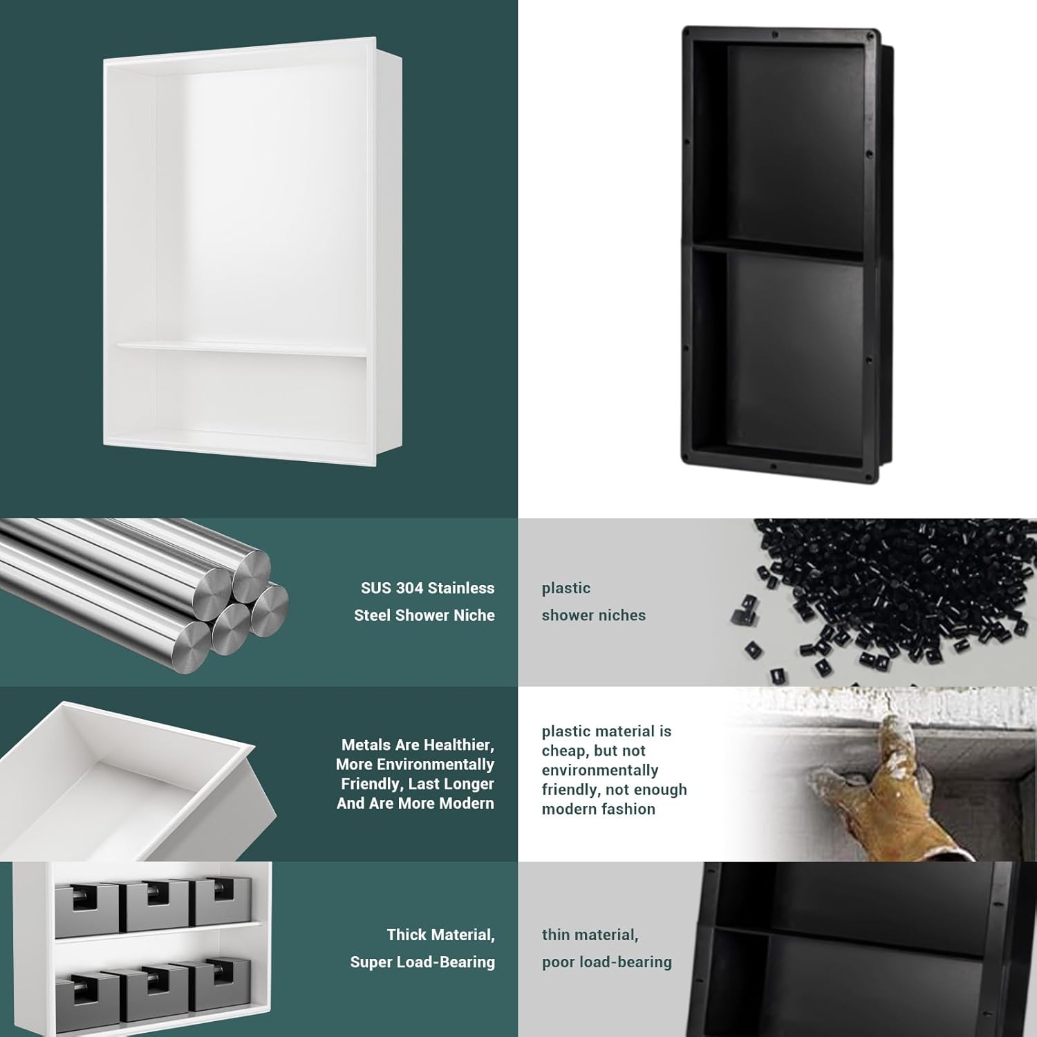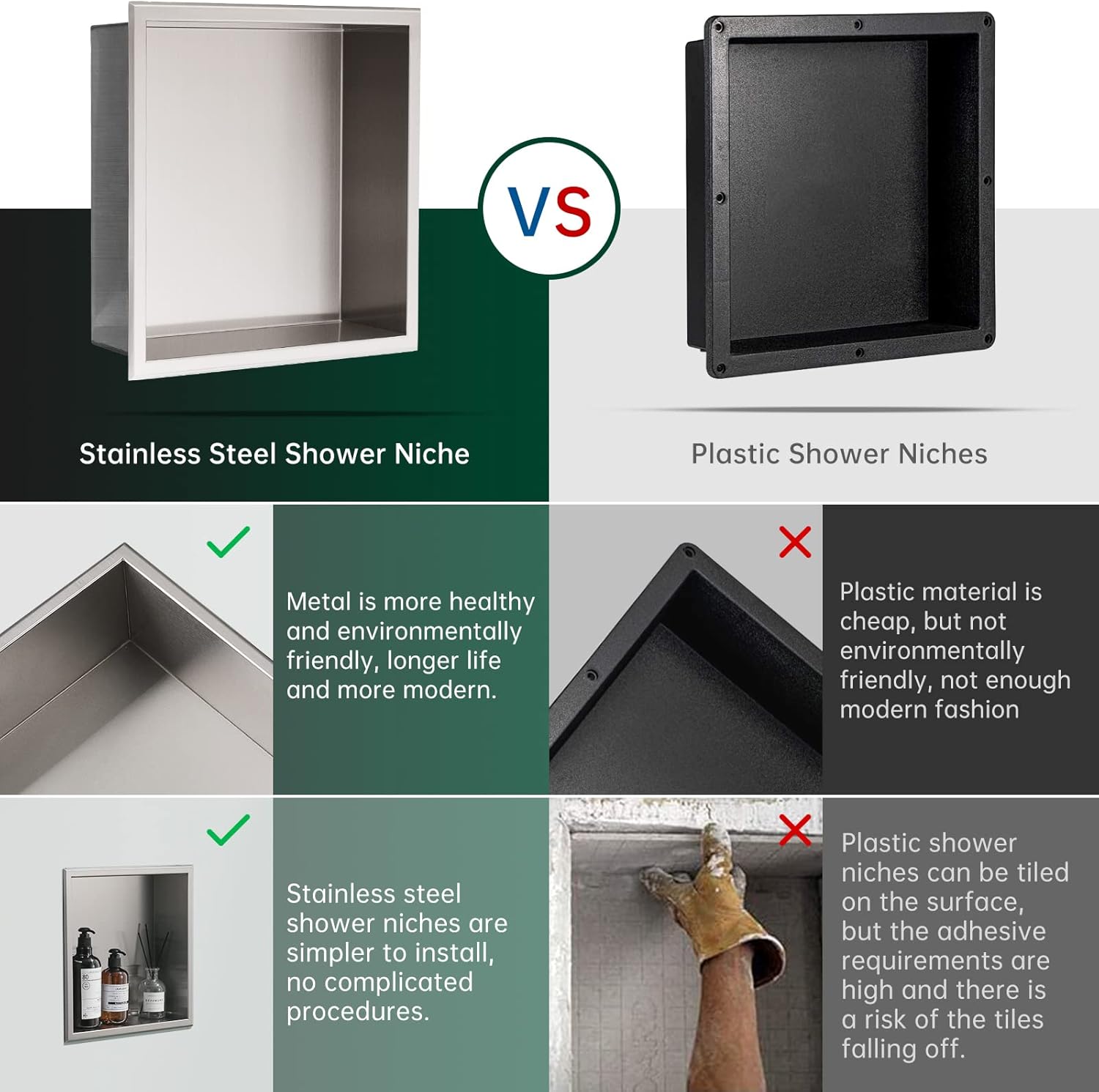 •  【 HEAVY-DUTY MATERIALS】- The blylund shower niche is made of 304 stainless steel.Sturdy and durable, waterproof and rustproof, distinguishes itself from cheaper bathroom caddy with longer life and aesthetics.
