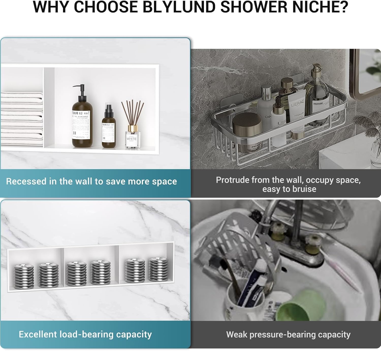 • 【SIMPLE INSTALLATION】- BLYLUND shower niche shelves can be installed without complicated procedures, you just need to cut the right size on the wall according to the dimensions and then follow the steps in the instruction manual to install.