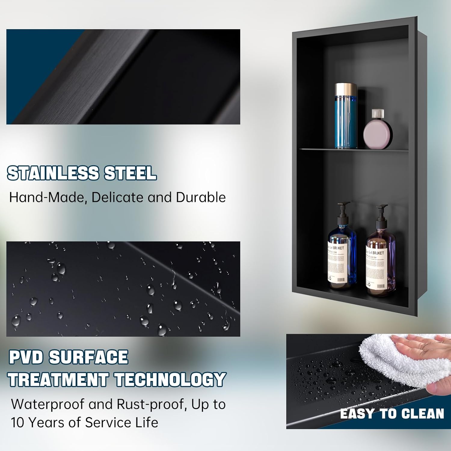 • 【EXQUISITE CRAFTSMANSHIP】- BLYLUND uses PVD technology to treat the surface of the shower niche so that it is fingerprint and oil resistant and only needs to be cleaned with a rag.