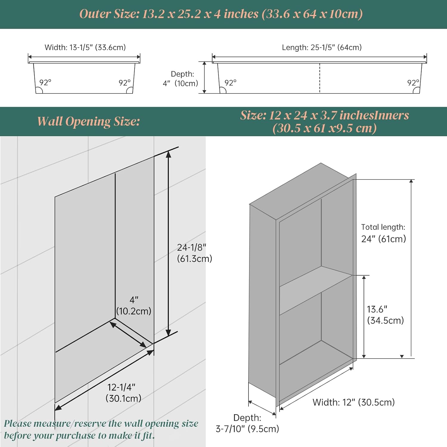 • 【 SIZING INFORMATION】- Outer Size:33.6 x 64 x 10cm/ 13.25" Width x 25.25" Height x 4" Depth. Inner Size: 30.5 x 61 x 10cm/ 12"Width x 24" Height x 4"Depth. Deep enough for almost any bathroom product .