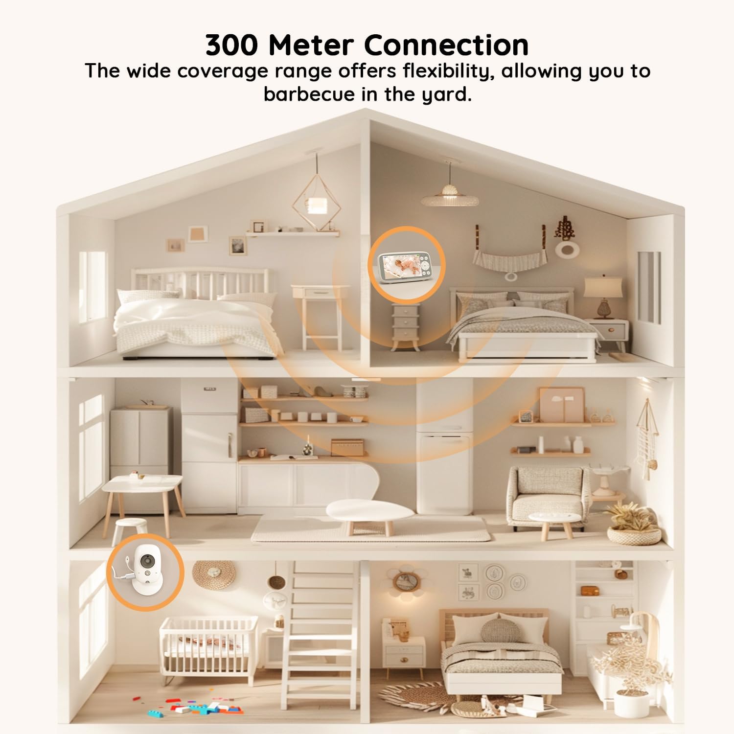 - [๐๐๐-๐๐๐ญ๐๐ซ ๐๐จ๐ง๐ง๐๐๐ญ๐ข๐จ๐ง ๐๐๐ง๐ ๐ | ๐๐จ๐ฆ๐ฉ๐ฅ๐๐ญ๐ ๐๐จ๐ฏ๐๐ซ๐๐ ๐]With an impressive 300-meter barrier-free range, this baby monitor ensures seamless coverage, whether youโre in a multi-storey home, on the terrace, or camping outdoors. The FHSS spread spectrum and GFSK frequency modulation ensure that no WiFi or app is required for a stable, secure connection. Perfect for when you're cooking in the kitchen, working in the garage, or relaxing by the pool.