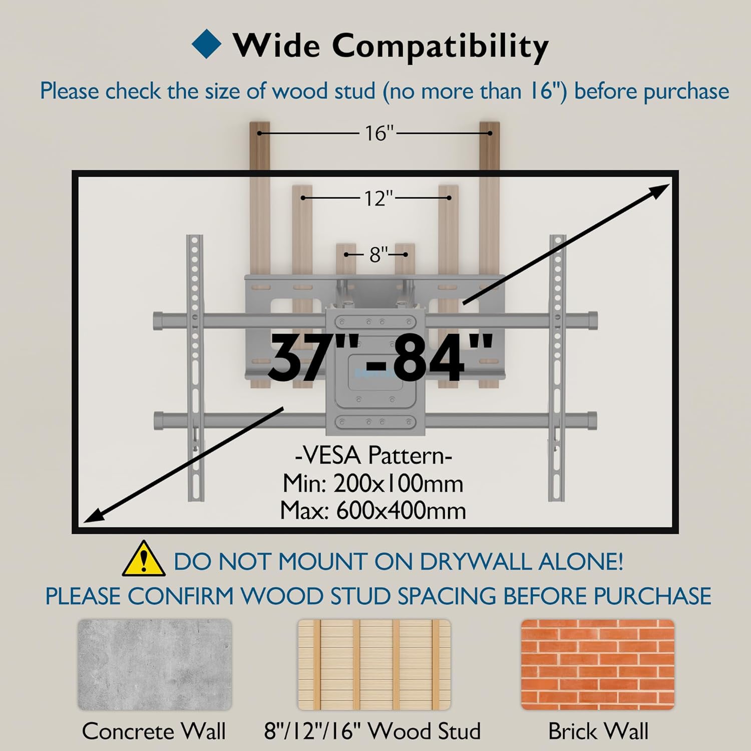 UNIVERSAL COMPATIBILITY FOR MULTIPLE TV SIZES: This full motion tv wall mount fits most 37 to 84 inch LED, LCD, OLED flat and curved TVs. It supports VESA from 200x100 to 600x400mm, holding up to 132lbs. Suitable for 32 inch tv wall mount, 55 inch tv wall mount, 65 inch tv wall mount, 75 inch tv wall mount, and 84 inch tv wall mount.
