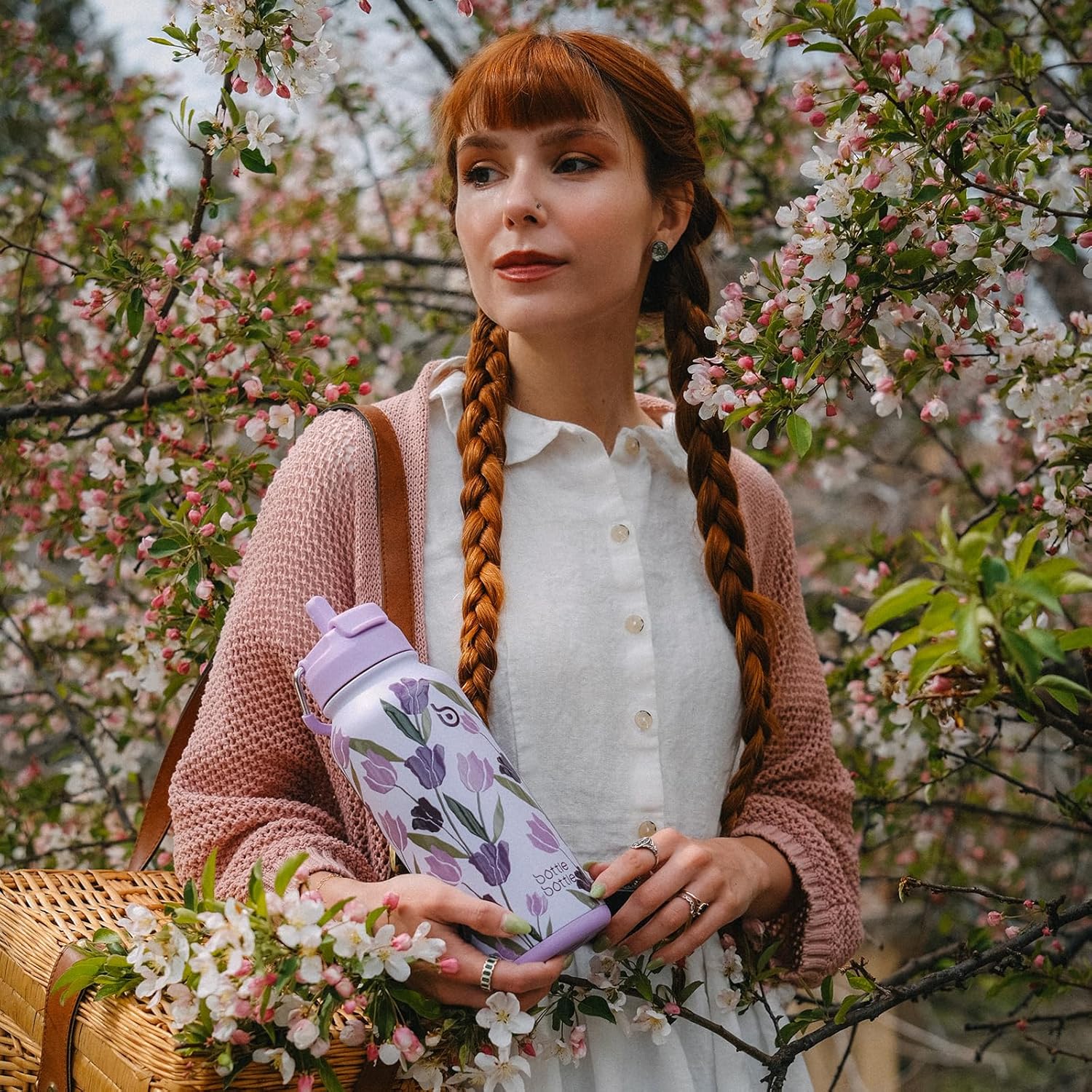 Bottle Bottle 32oz Insulated Water Bottle Stainless Steel Sport Water Bottle with Straw Dual-use Lid Design for Gym with Pill Box (Purple Tulips)