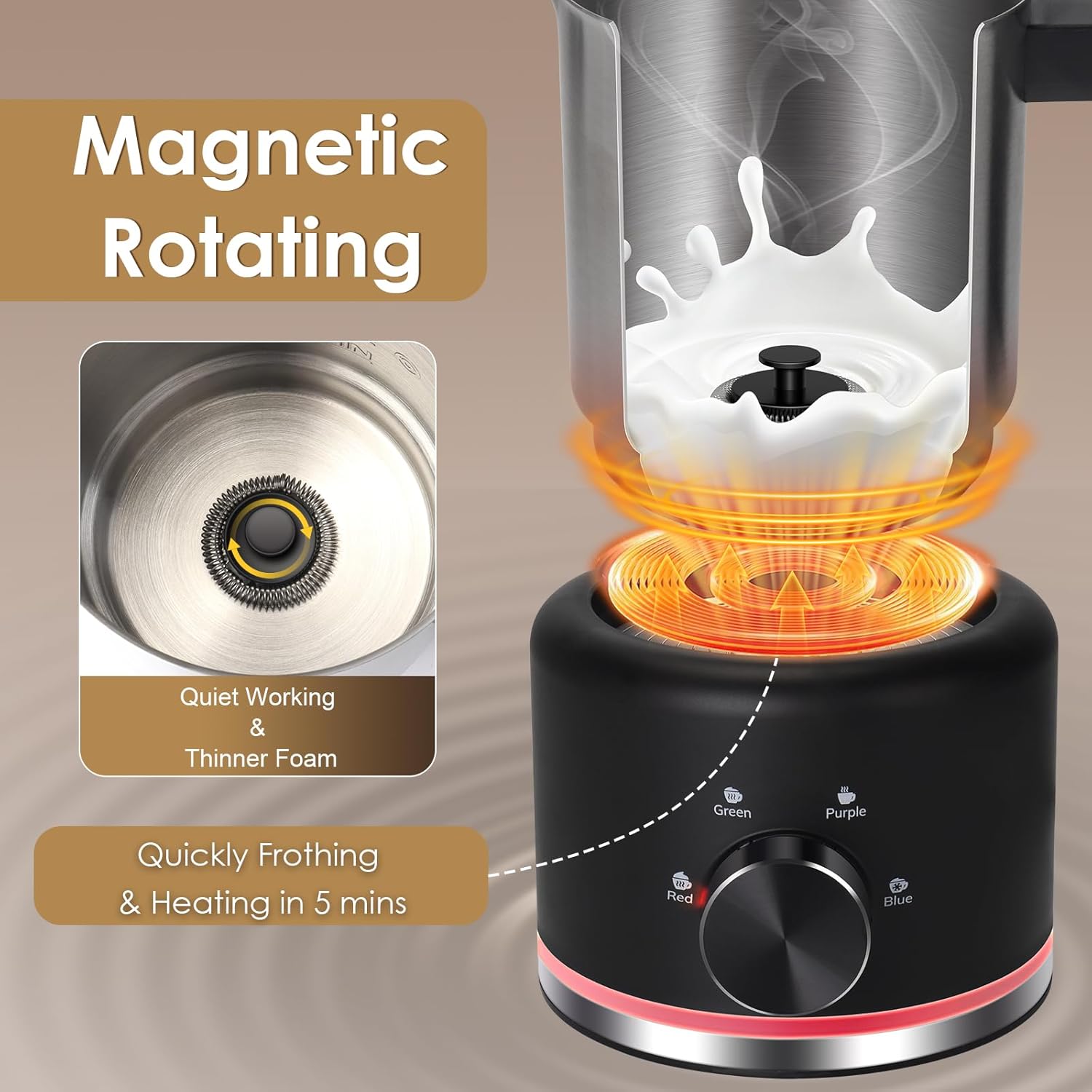 - 𝐌𝐚𝐠𝐧𝐞𝐭𝐢𝐜 𝐑𝐨𝐭𝐚𝐭𝐢𝐧𝐠 𝐓𝐞𝐜𝐡𝐧𝐨𝐥𝐨𝐠𝐲-The rotating whisk inside the milk frother electric's container to spin and agitate the milk, introducing air and creating foam, that makes stable and consistent frothing what brings consistent agitation, the milk foamer for coffee ensures the foam tinier than other traditional milk frother. Compared to other milk frother, the magnetic rotation technology minimizes the friction between the whisk and the container, improving durability, and making the frother run more quietly.