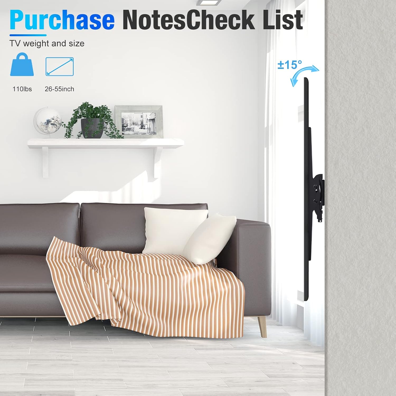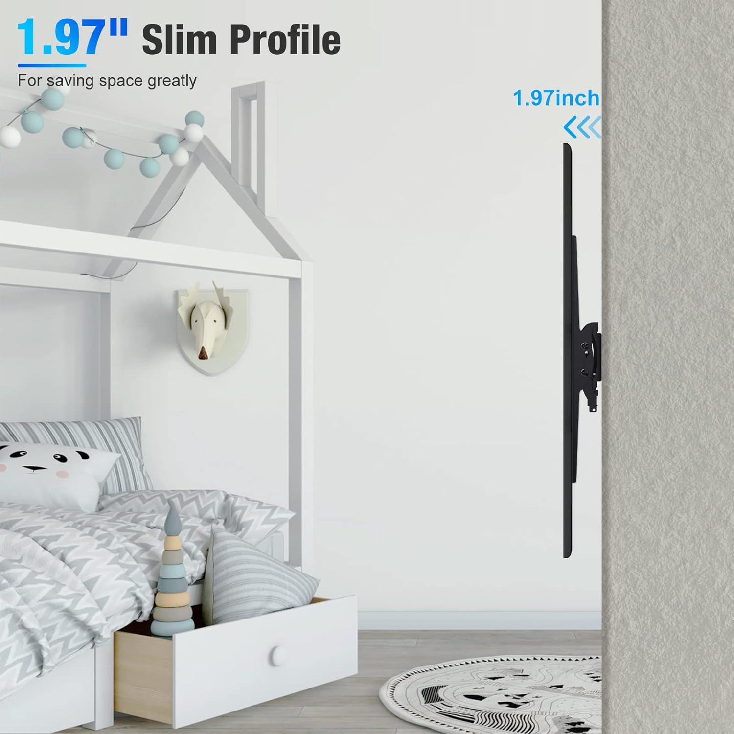 - Save Space and Anti Glaring: Our TV wall mount sits a mere 1.9 inch to the wall for a low-profile modern look. Features +10°/-10° tilt allows you to direct the screen up and down to reduce glare and improve your viewing angle. All these will make your TV flexibility and better view based on your seat in the room.
