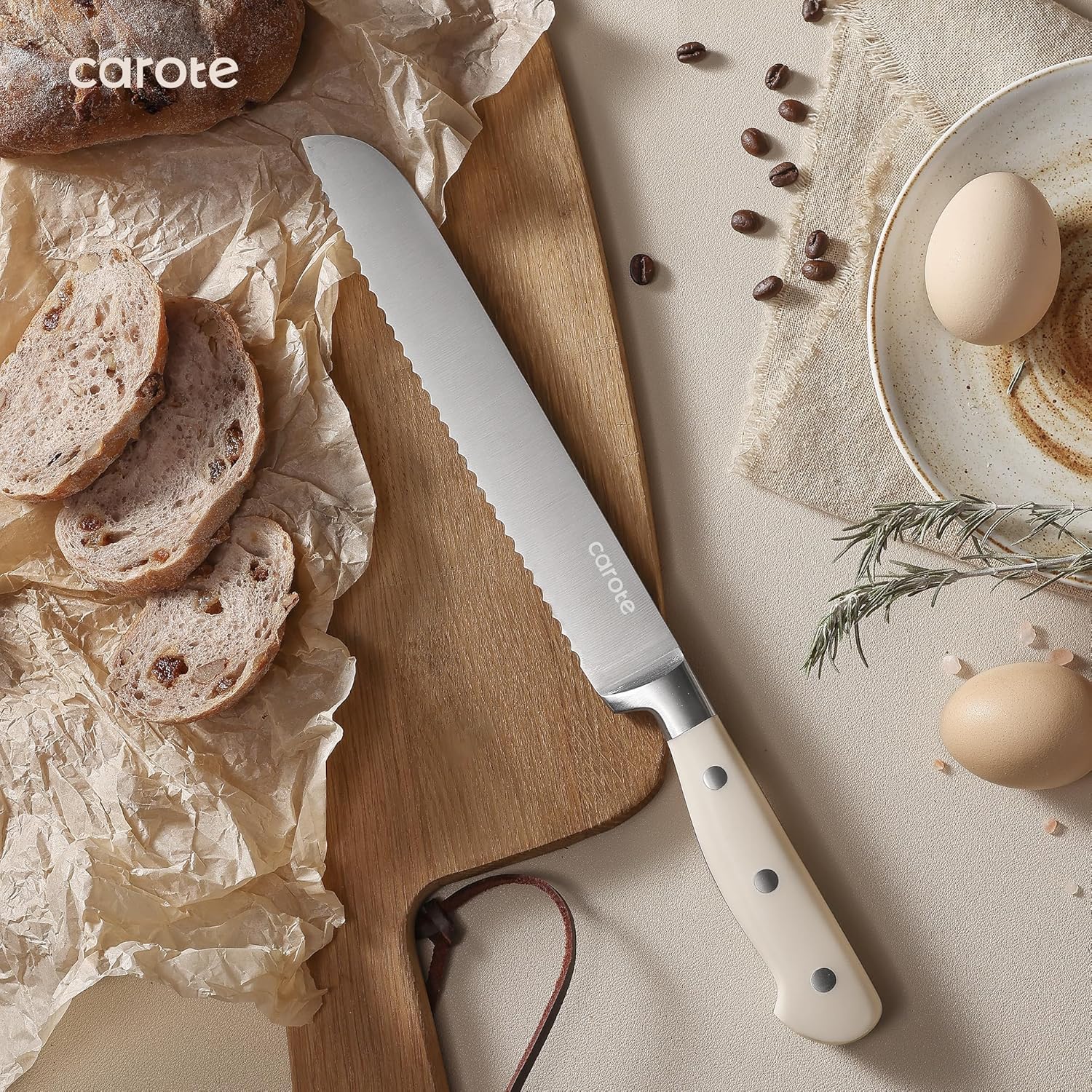 CAROTE 14 Pieces Knife Set with Block, Forged, High Carbon Stainless Steel Sharp Blade Block Knife Set, Dishwasher Safe Cutlery, Cream