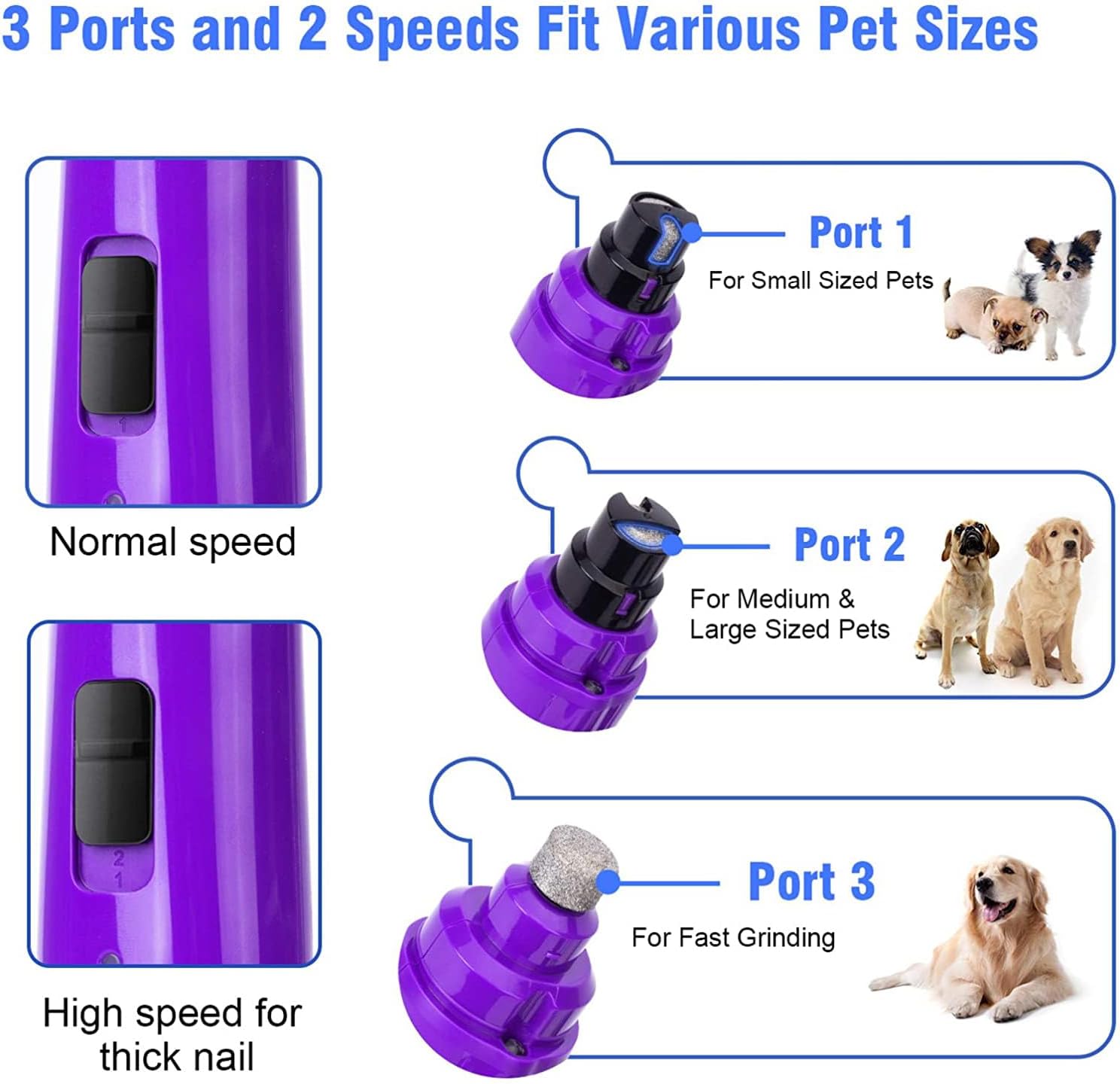 - Advanced 2-Speed Switch & 3 Grinding Ports: The trimmer features an adjustable, low-high speed design powerful enough support heavy grinding. And with 3 ports to match small, medium, or large pets, simply choose the appropriate port and speed depending on your pet's size and nail hardness.