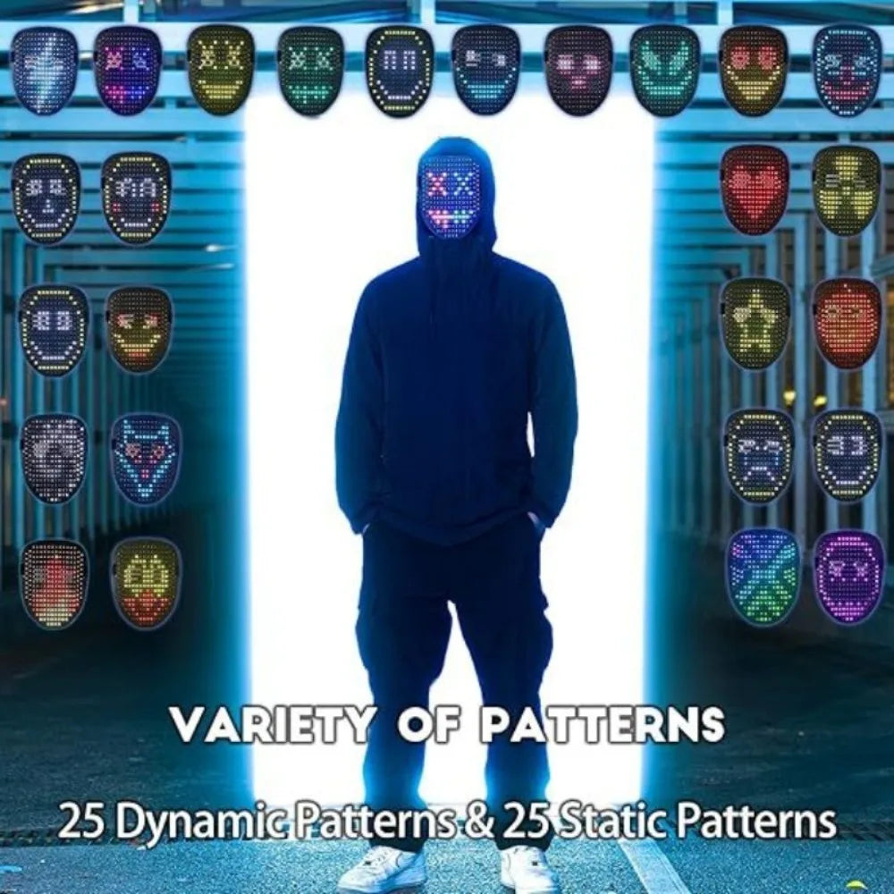 Packed with 284 bright LEDs, this mask features 50 incredible display patterns, including 25 animated effects and 25 static images in an array of color modes—from smooth gradients to bold multi-color flashes. Switch your expression on the fly with gesture sensing technology—just wave your hand to light up in style, no buttons needed.