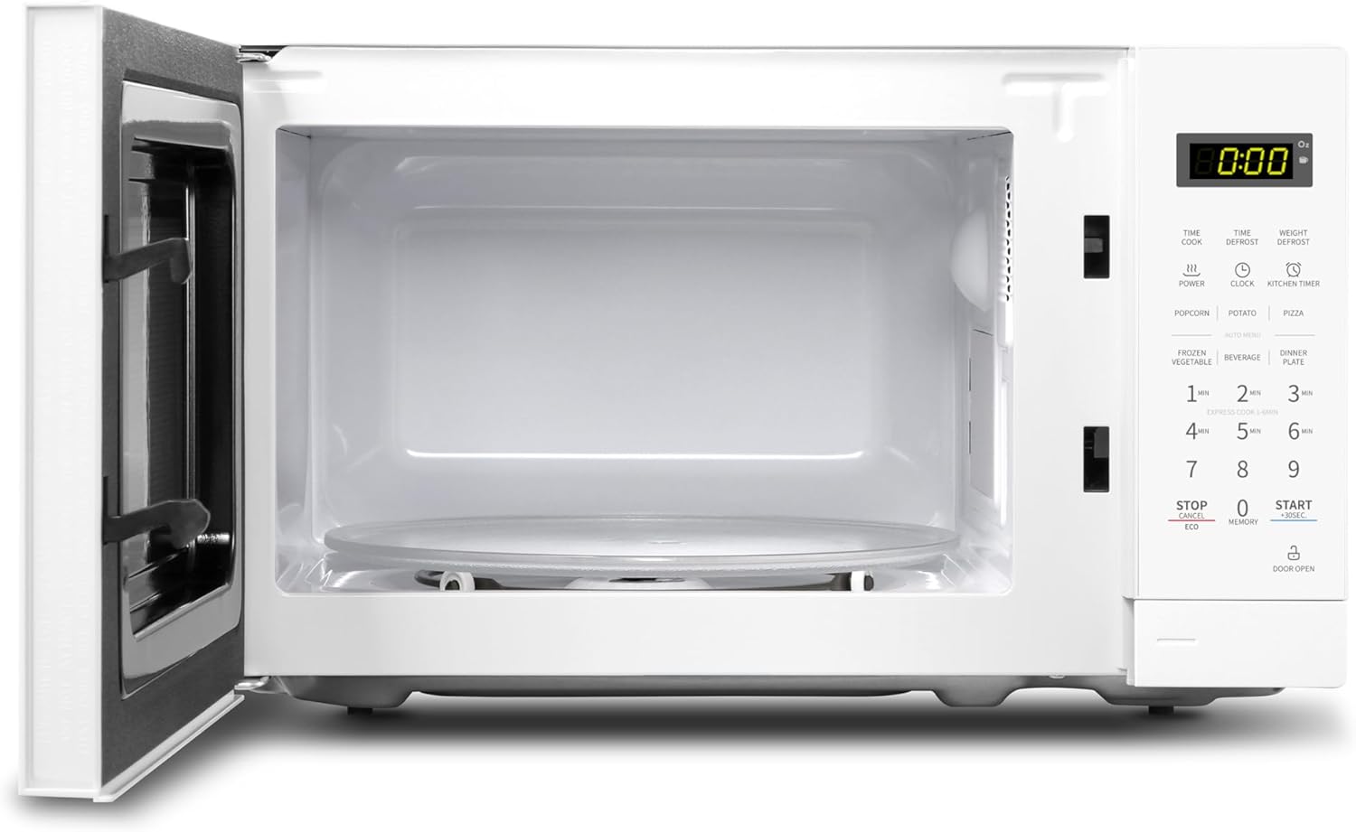 • Bright LED digital display, easy-to-read control panel, interior light and removable glass turntable, clock & kitchen timer, child safety lock