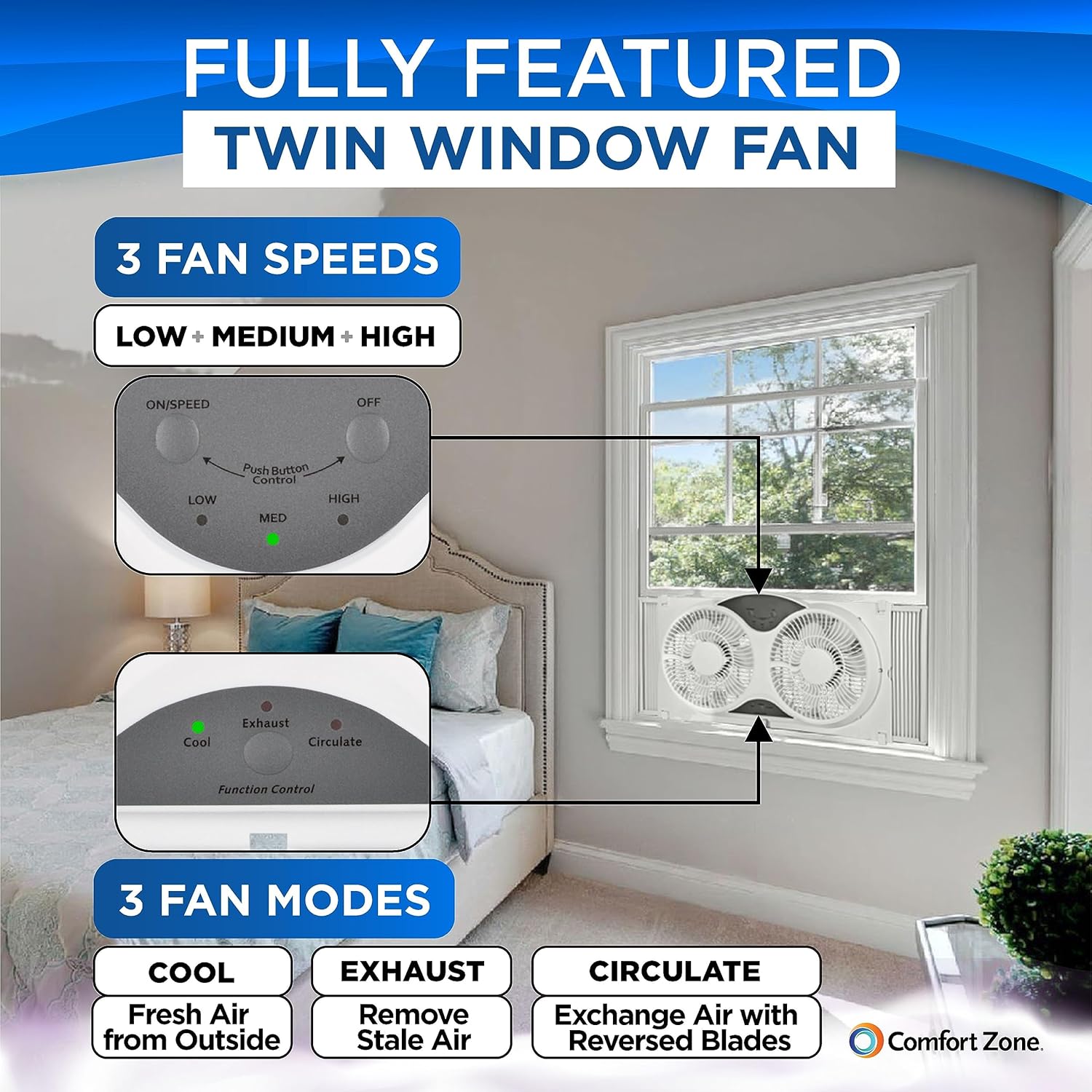 Comfort Zone 9-Inch Window Fan with Dual 3-Speed Fans, Auto-Locking Expanders, 3 Modes (Cool, Circulate, Exhaust), Wi-Fi App Control, Fabric Cover & Bug Screen