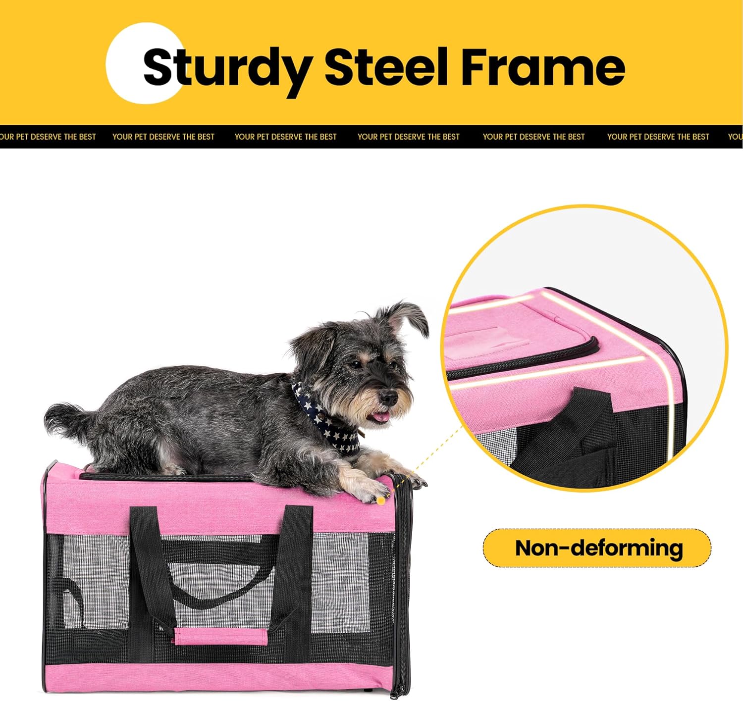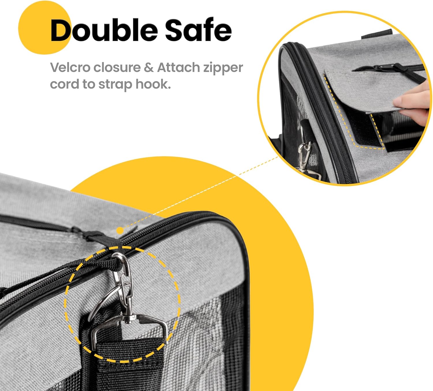 - DOUBLE SAFET:This pet carrier is made of durable polyester and steel frame with Velcro closure. You can also fasten the zipper cord to the shoulder strap hook for extra safety.There's even a safety leash inside to keep your pet comfy and secure.
