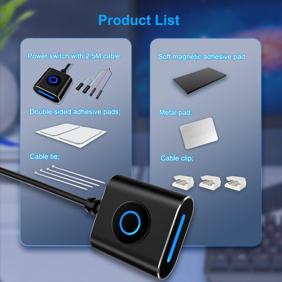 【External PC Power Switch】 This desktop PC power button comes with a 2.5-meter extension cable and an LED indicator light. It can be used to extract the power/reset button from the computer case and place it anywhere for easy operation.
