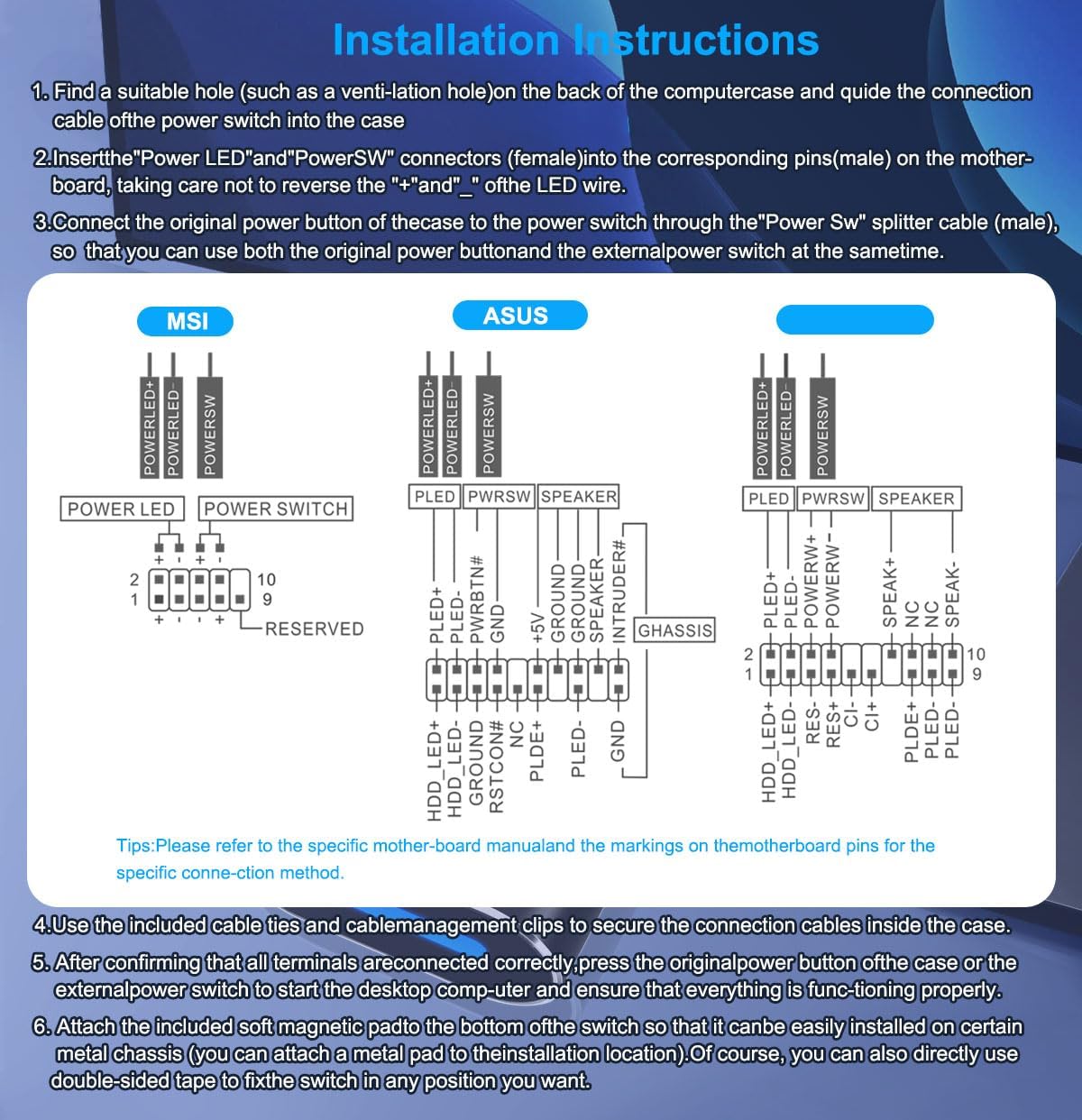 【Rich Accessories and Easy Installation】 Equipped with soft magnetic adhesive pad, metal pad, cable clips, cable ties, Double-sided adhesive pads, suitable for various installation methods. Comes with installation instructions, you can easily install it by following the instructions. Note: Please confirm whether the product is compatible with your computer before purchasing (it has separate 2.54mm DuPont connectors), usually suitable for computers such as ATX and MATX.