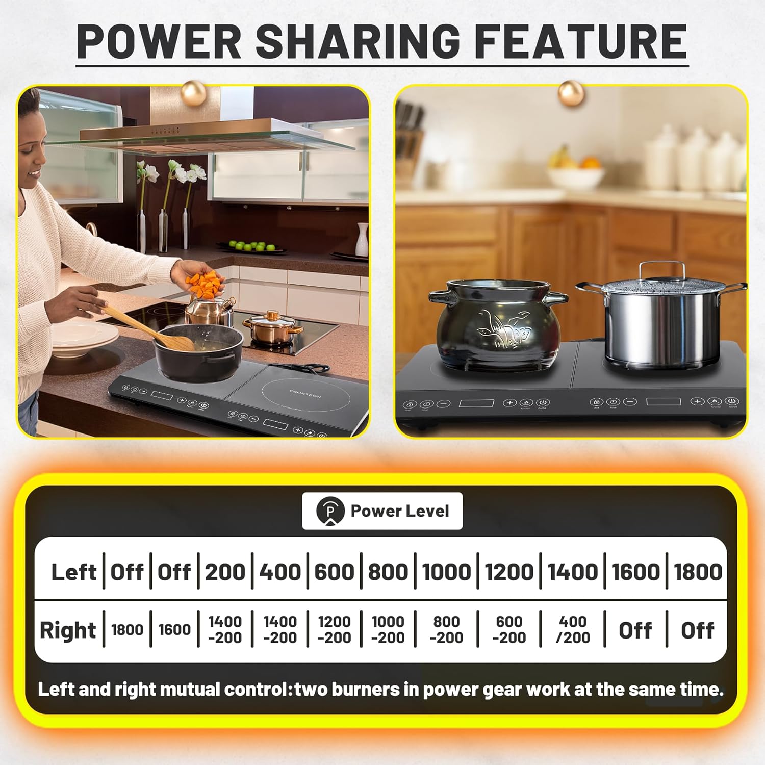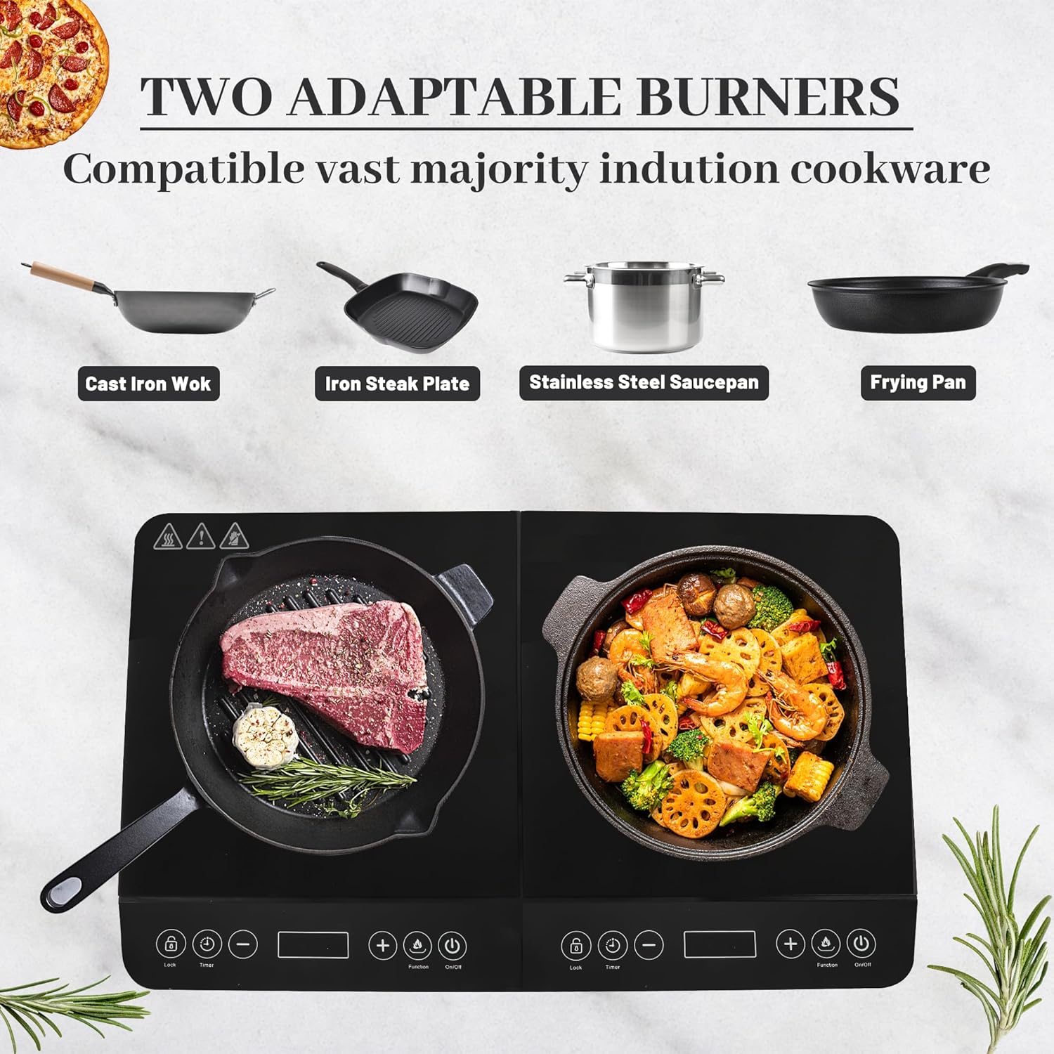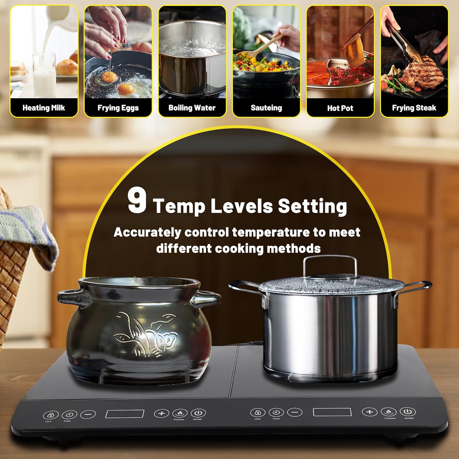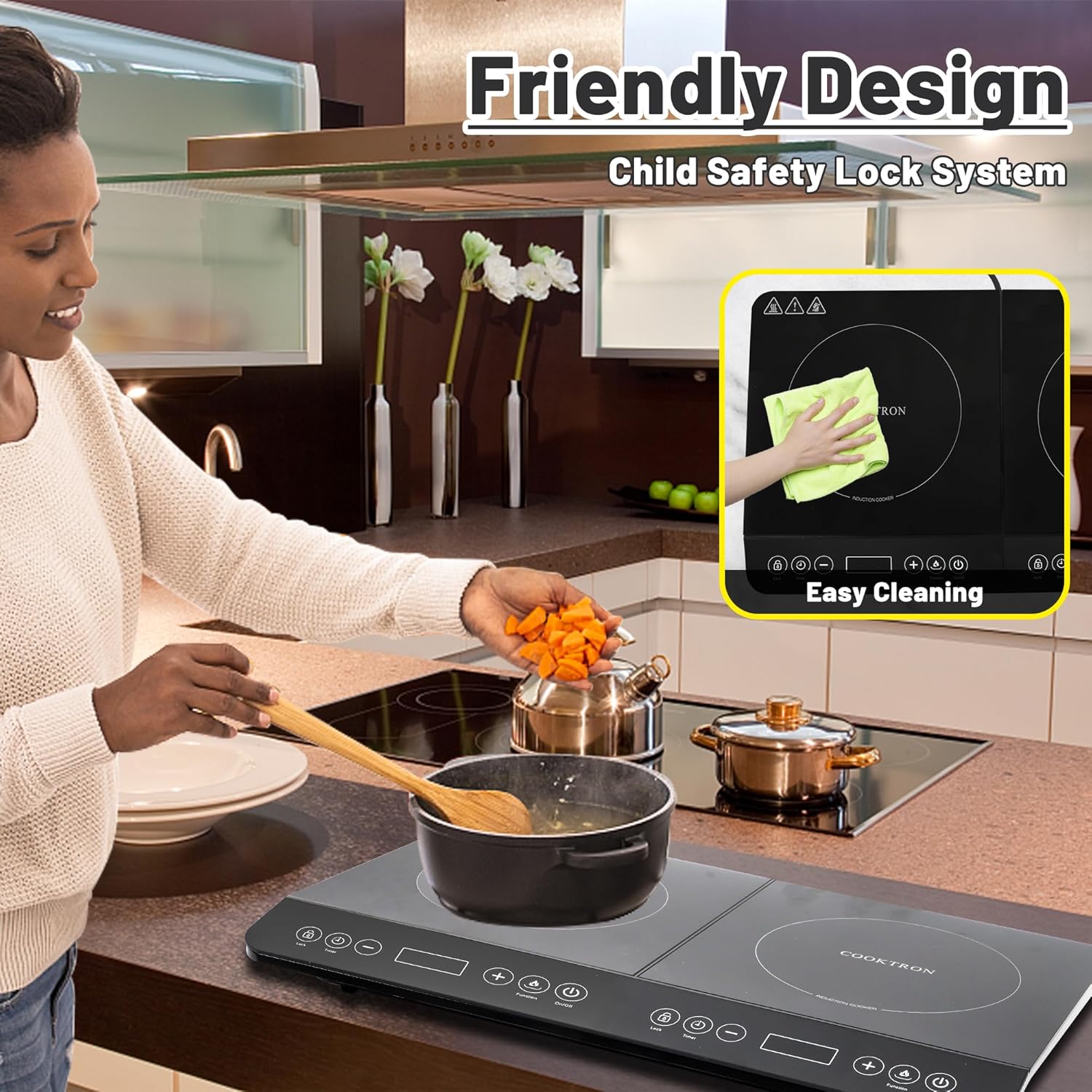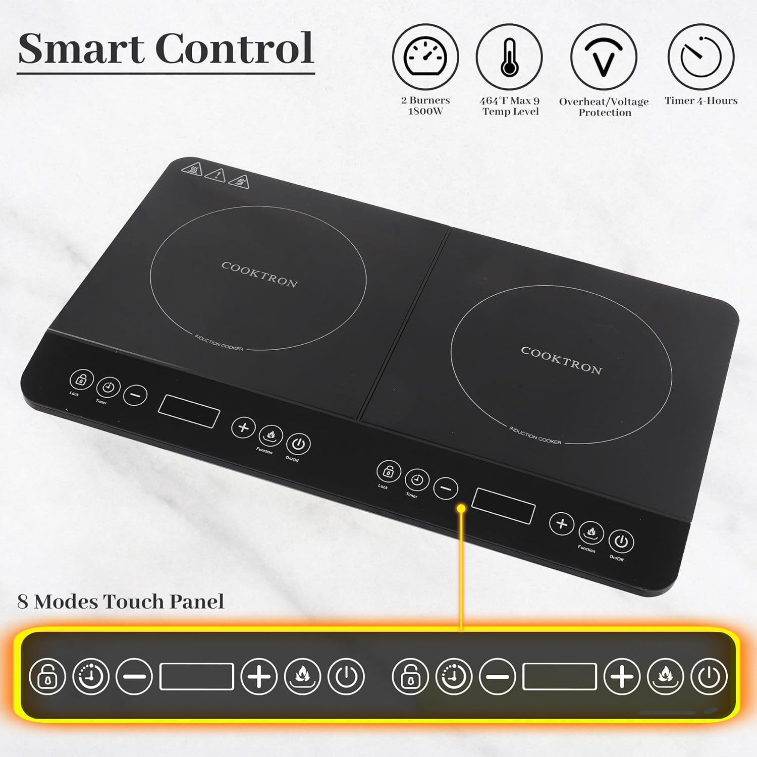 COOKTRON Double Induction Cooktop Burner, 1800W Induction Countertop 2 Burner Portable, Precision Temperature Independent Control, 10 Temperature 9 Power Settings, with Child Safety Lock & 4H Timer