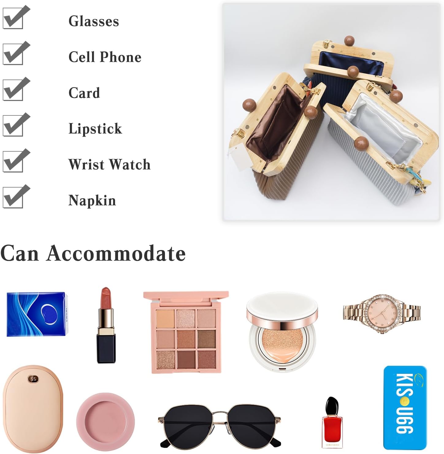 - 👝【High Quality Material】This evening bag is made of pu leather. The inside is soft polyester lining to prevent your stuff from being scratched. Premium wooden frame support, wooden frame is very retro. The colourful locking chain adds a sense of fashion to the modern style. This clutch purse was designed with unique wooden bead kissing buckle, it is easy to open and close.