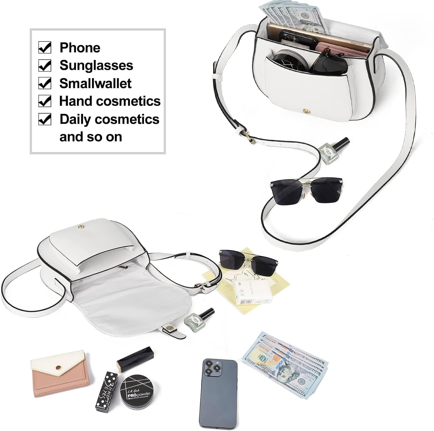- Practical Design: 1front pocket design,2 slip pockets and 1 zip pocket inside for well organized and convenient access. The main compartment fits phone,keys,sunglasses,small wallet or other small daily stuff.