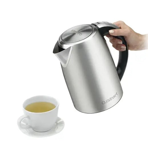 For tea to reach its full flavour, it should be steeped at just the right temperature. The Cuisinart PerfecTemp Electric Kettle has 6 preset temperatures for different varieties of tea. 1500-watts provide fast heat-up, and a Keep Warm option will maintain the set temperature for 30 minutes. The kettle can even be removed from the power base for up to 2 minutes without shutting off. Cuisinart continues to make life civilized, easy and delicious! Features: • 1.7-liter capacity • 6 preset temperatures • One-touch controls with blue LED indicators • 30-minute Keep Warm option • Memory feature allows kettle to be lifted off base for 2 minutes without shutting off or losing its place in the brewing process • 1500 watts for fast heat-up • Blue backlit water window • 360º swivel cordless connector • Stay-cool nonslip handle • Concealed heating element to prevent mineral buildup • Removable/cleanable scale filter • Auto shutoff and boil dry protection