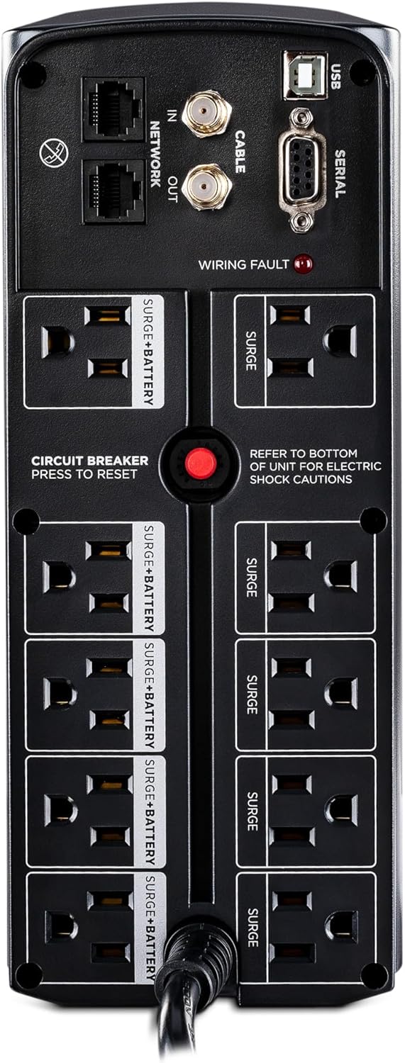 EIGHT NEMA 5-15R OUTLETS: Four battery backup & surge protected outlets, Four surge protected outlets; INPUT: NEMA 5-15P right angle, 45 degree offset plug with six foot power cord