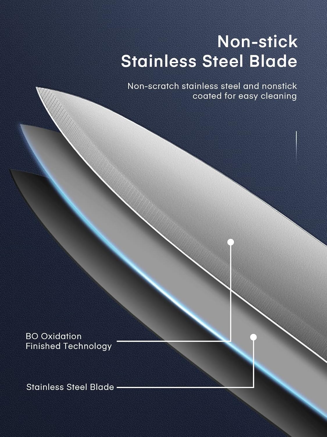 【BO Oxidation Technology】BO Oxidation technology suits an elegant and unique grey oxide layer on knives for true anti-rusting and anti-corrosion that can never be chipped off. Grey oxidation surface enhances the non-stick ability for easy cleaning.