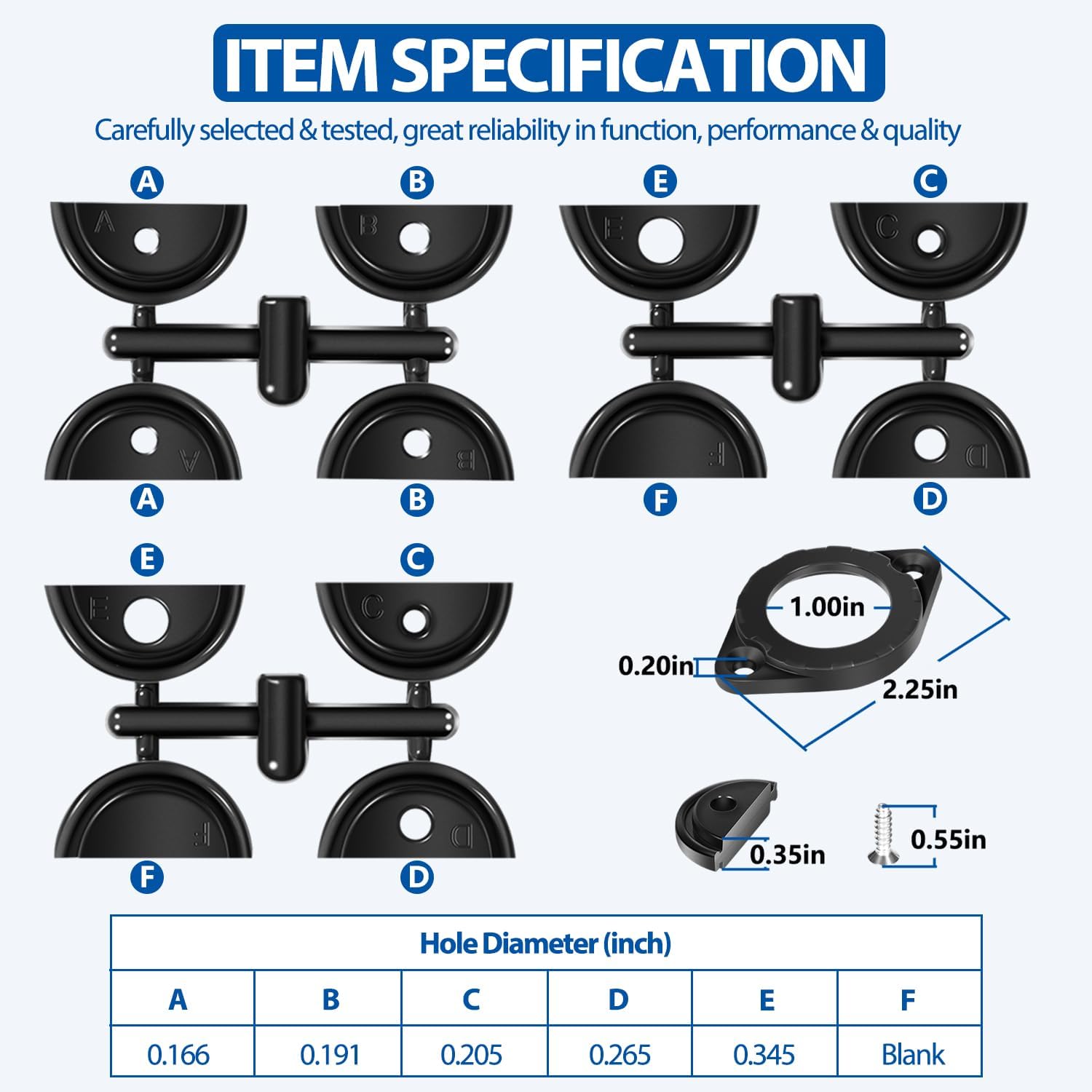 COMPLETE KIT - Package includes 8 rubber inserts with common hole sizes, 2 blank inserts, 2 nylon grommets, and 2 sets of hardware
