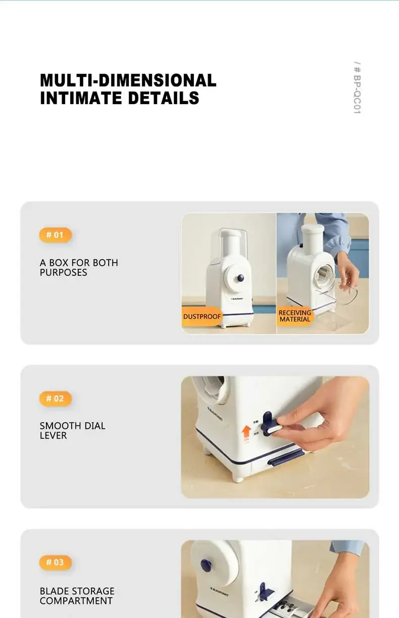 The Purilite Select Electric Vegetable Cutter offers a practical and efficient solution for home cooking. Its durable construction, multifunctional capability, and electric operation help streamline food preparation while maintaining consistent results. Designed for convenience and everyday use, it is an essential addition to kitchens focused on efficiency and ease.