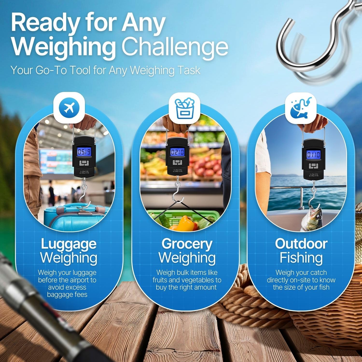 - 1x Travel Hanging Digital Fishing Scale, Portable Luggage Scale Electronic Backlight LCD Display 110lb/50kg Fish Hook Balance Smart Thermometer Weight for Tackle Box, Suitcase, BackPack, Batteries Included