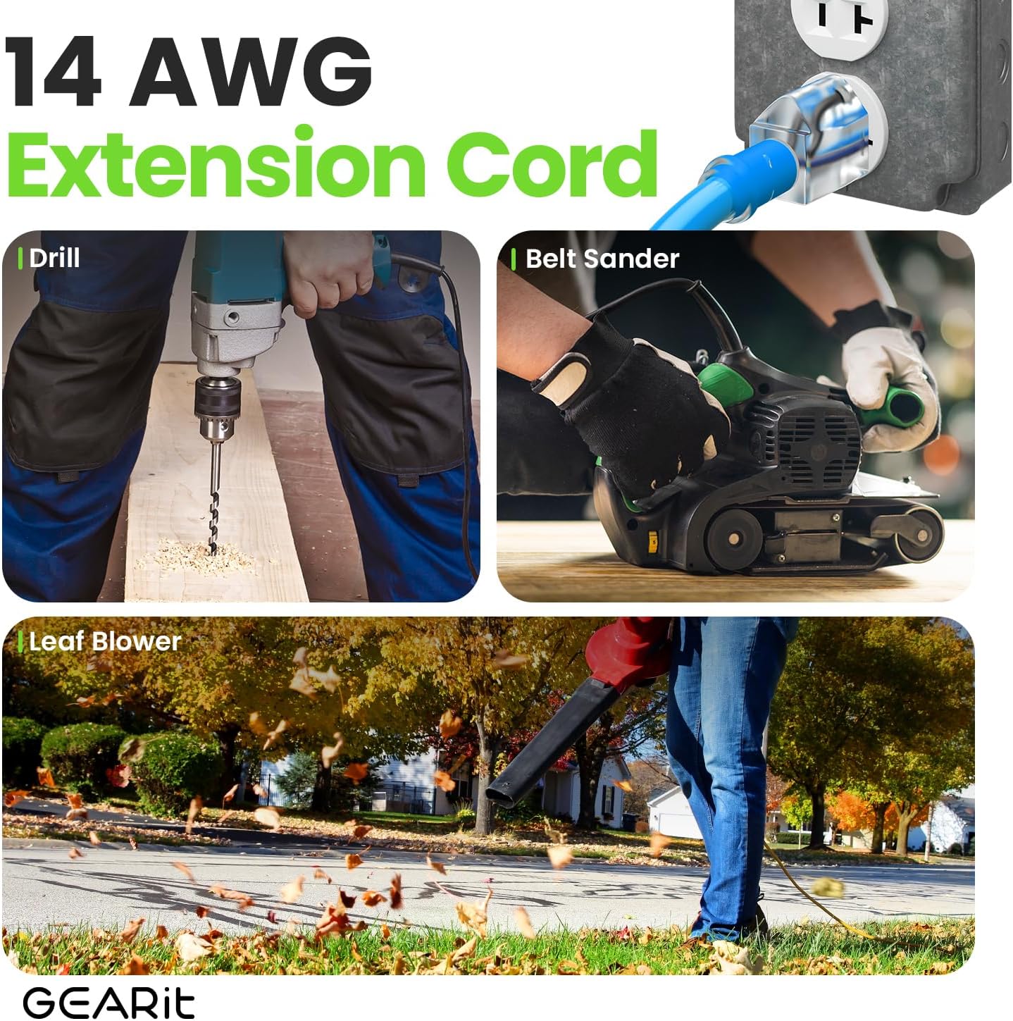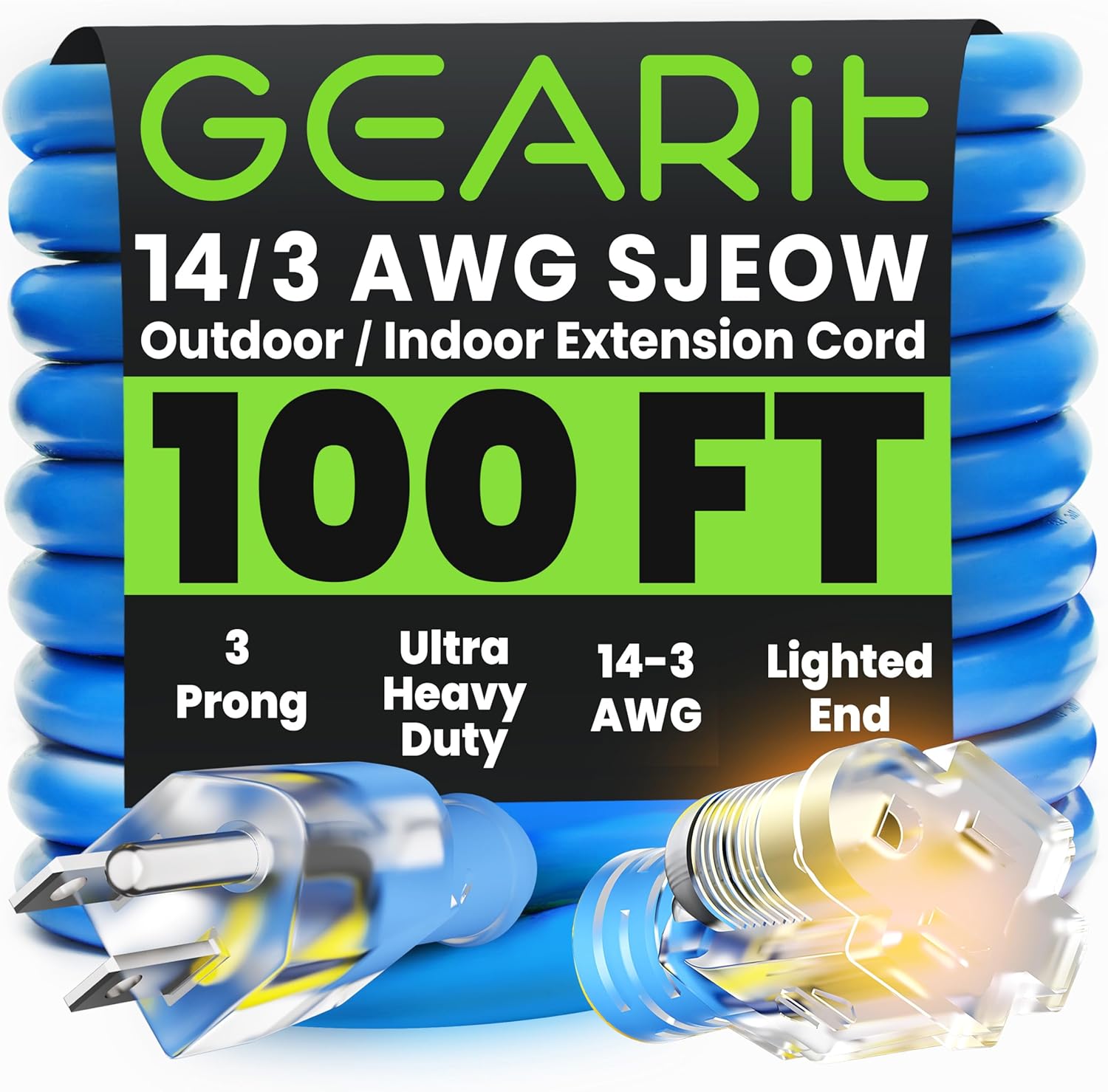 - GEARit 12/3 Outdoor Extension Cord - Use this 100-foot outdoor extension cord with 3-prong connectors to reach power tools, gardening appliances, snow throwers and other power-hungry pieces of equipment wherever you need them, from front yards to professional construction sites, in all weather conditions thanks to the SJEOW jacket design.